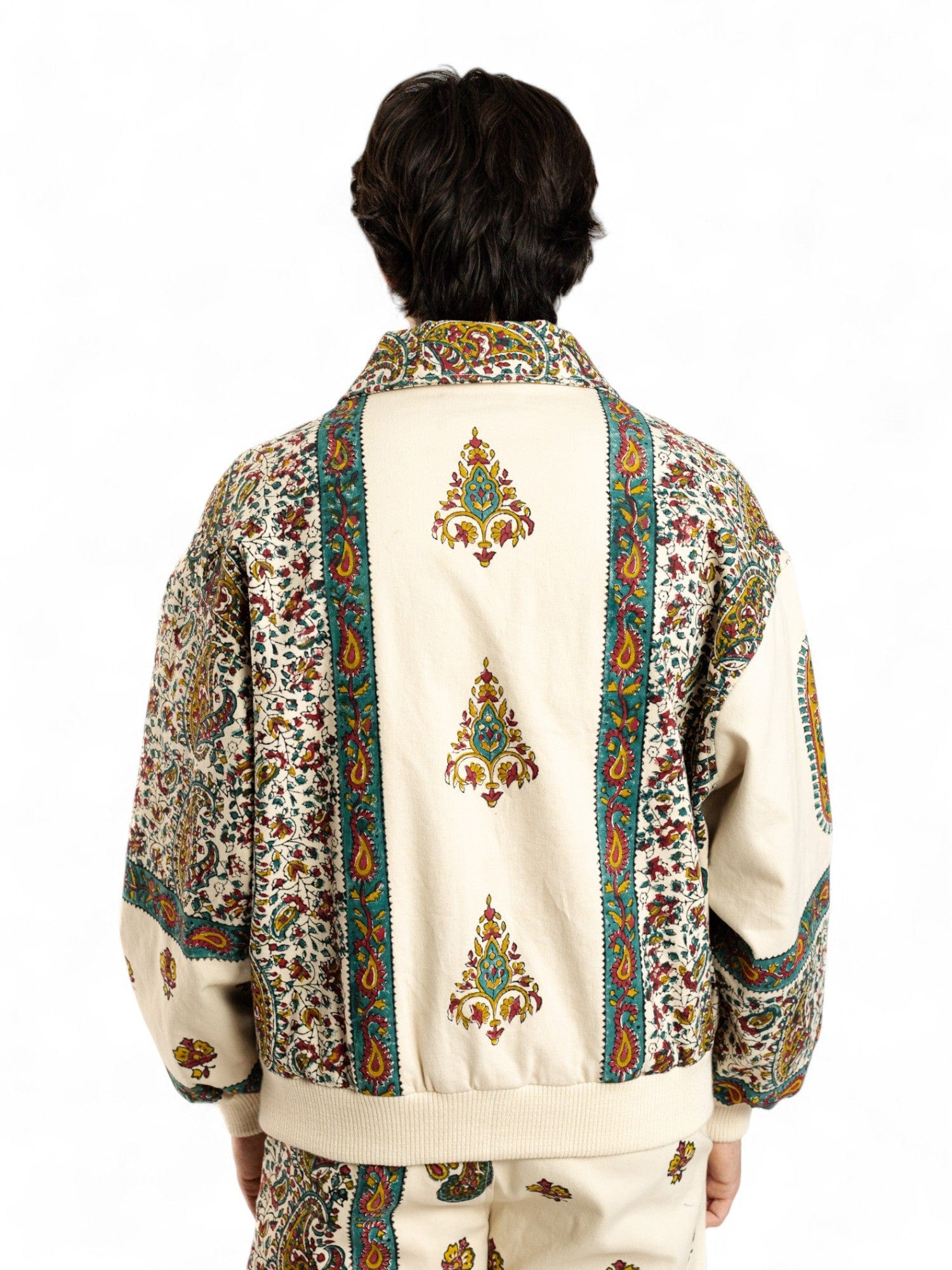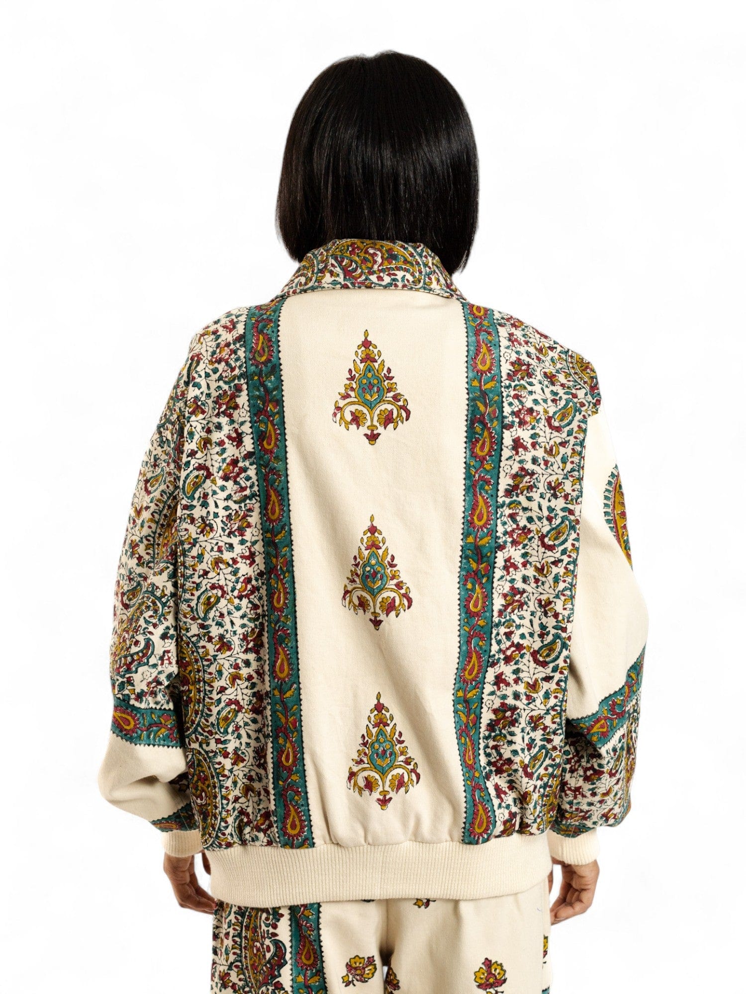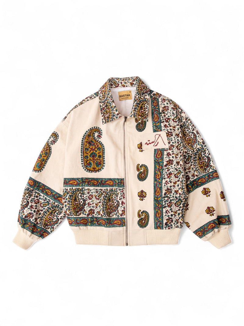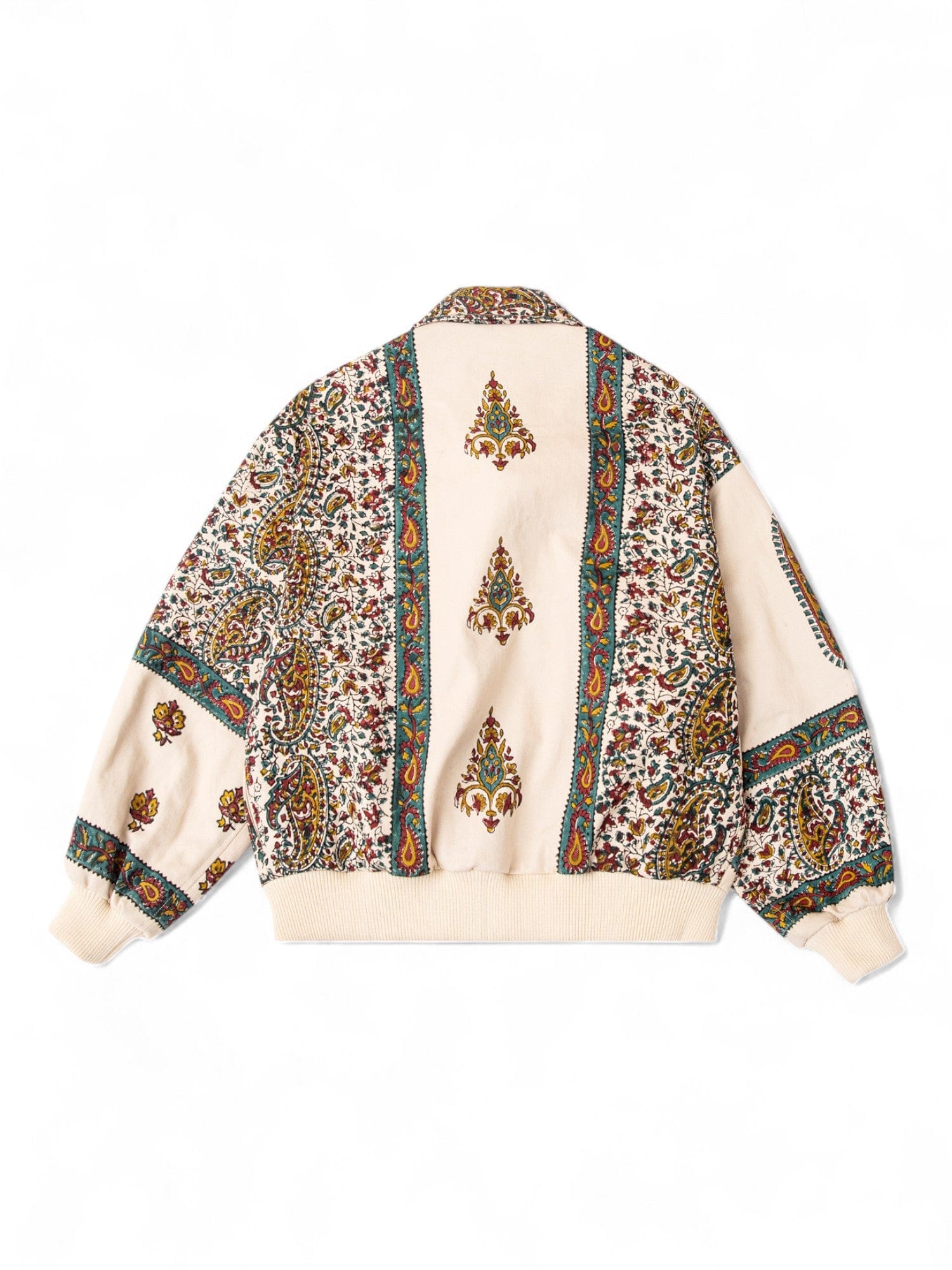 "95" BEIGE BLOCK PRINT BOMBER JACKET