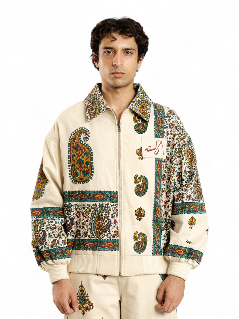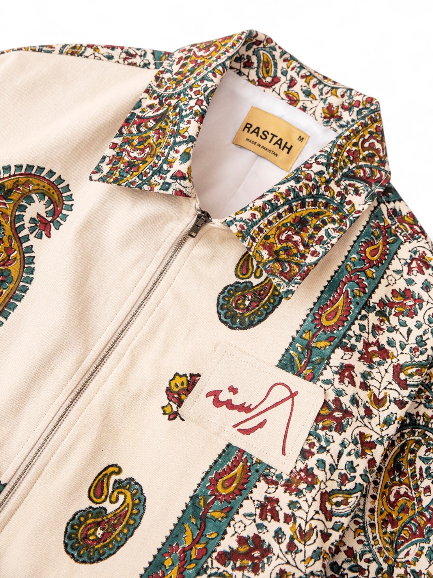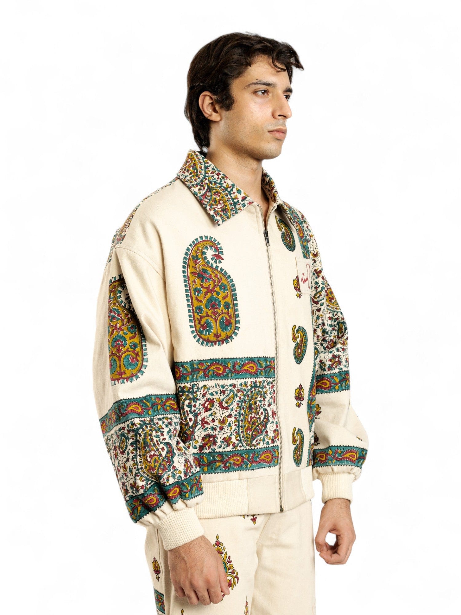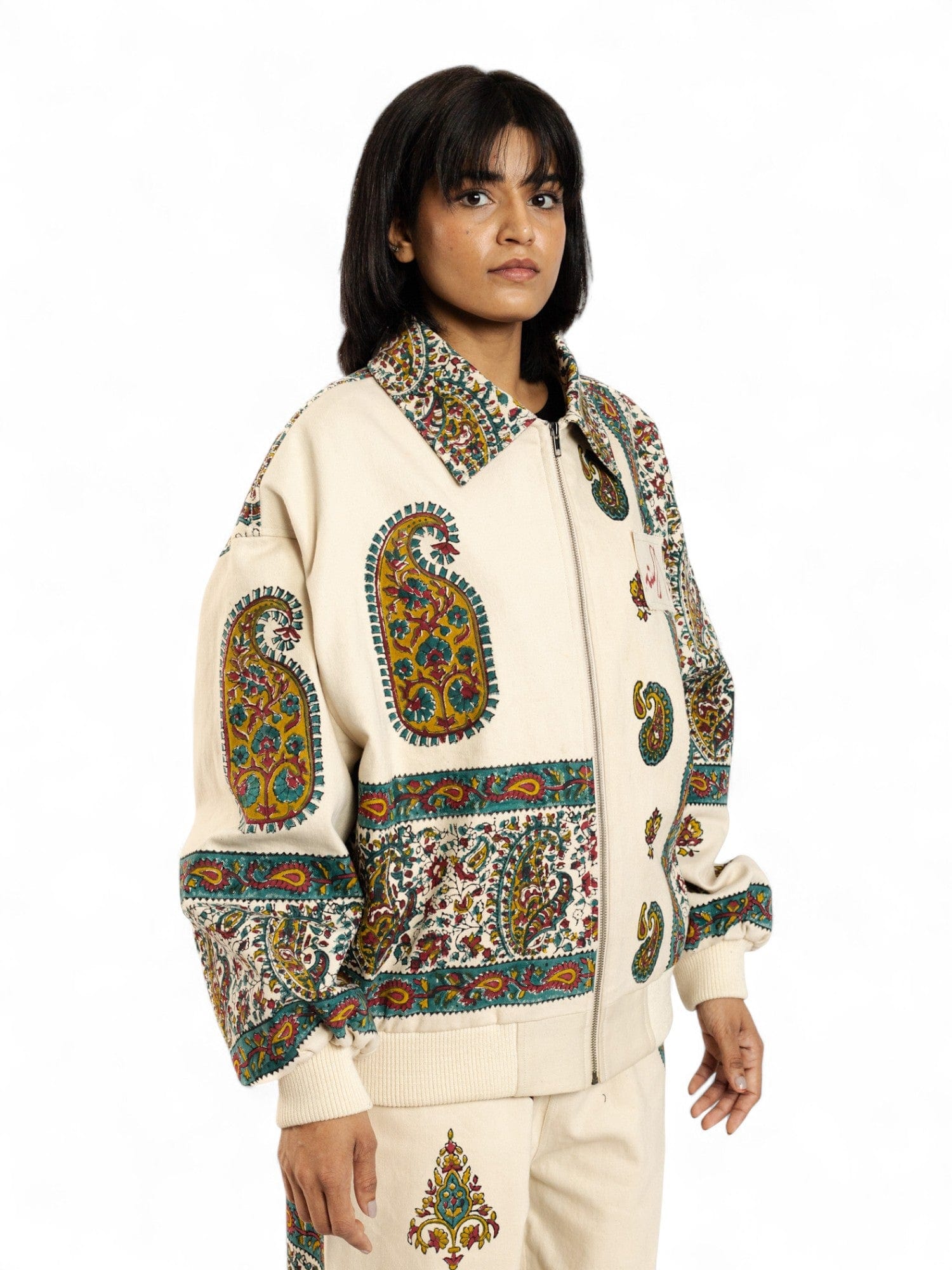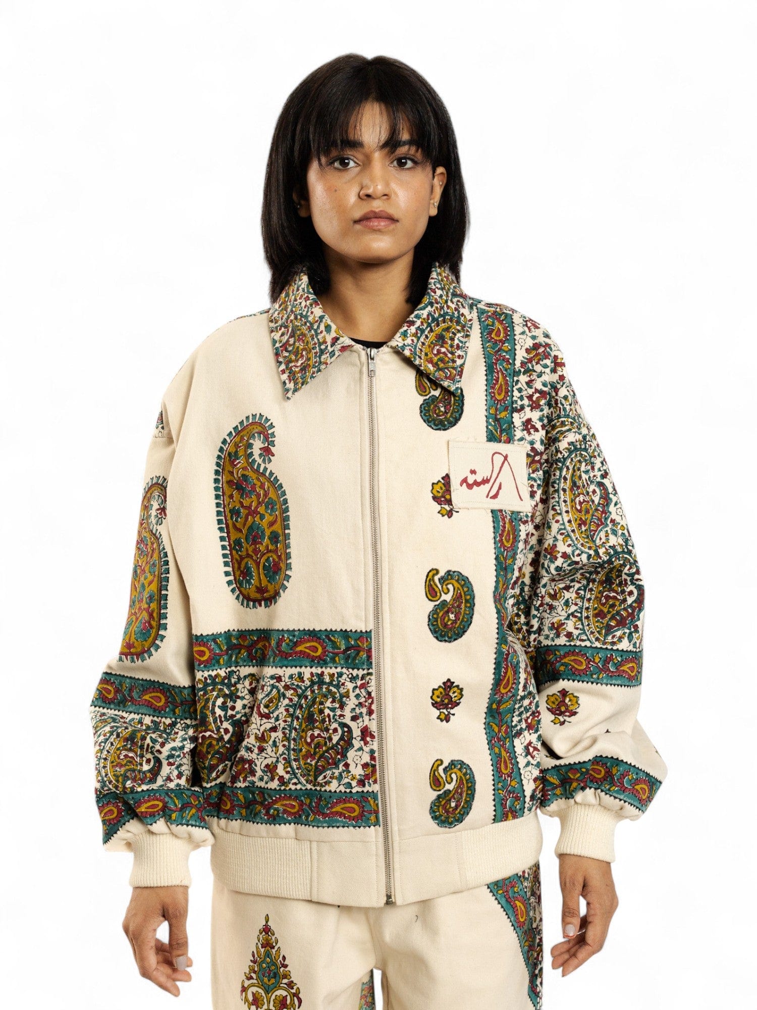 "95" BEIGE BLOCK PRINT BOMBER JACKET