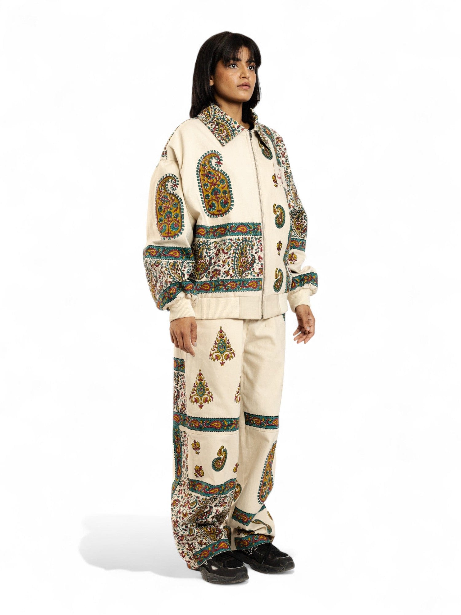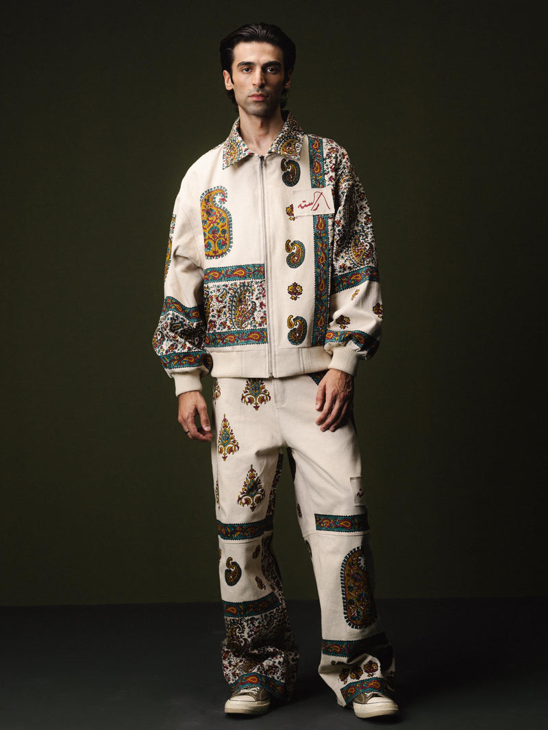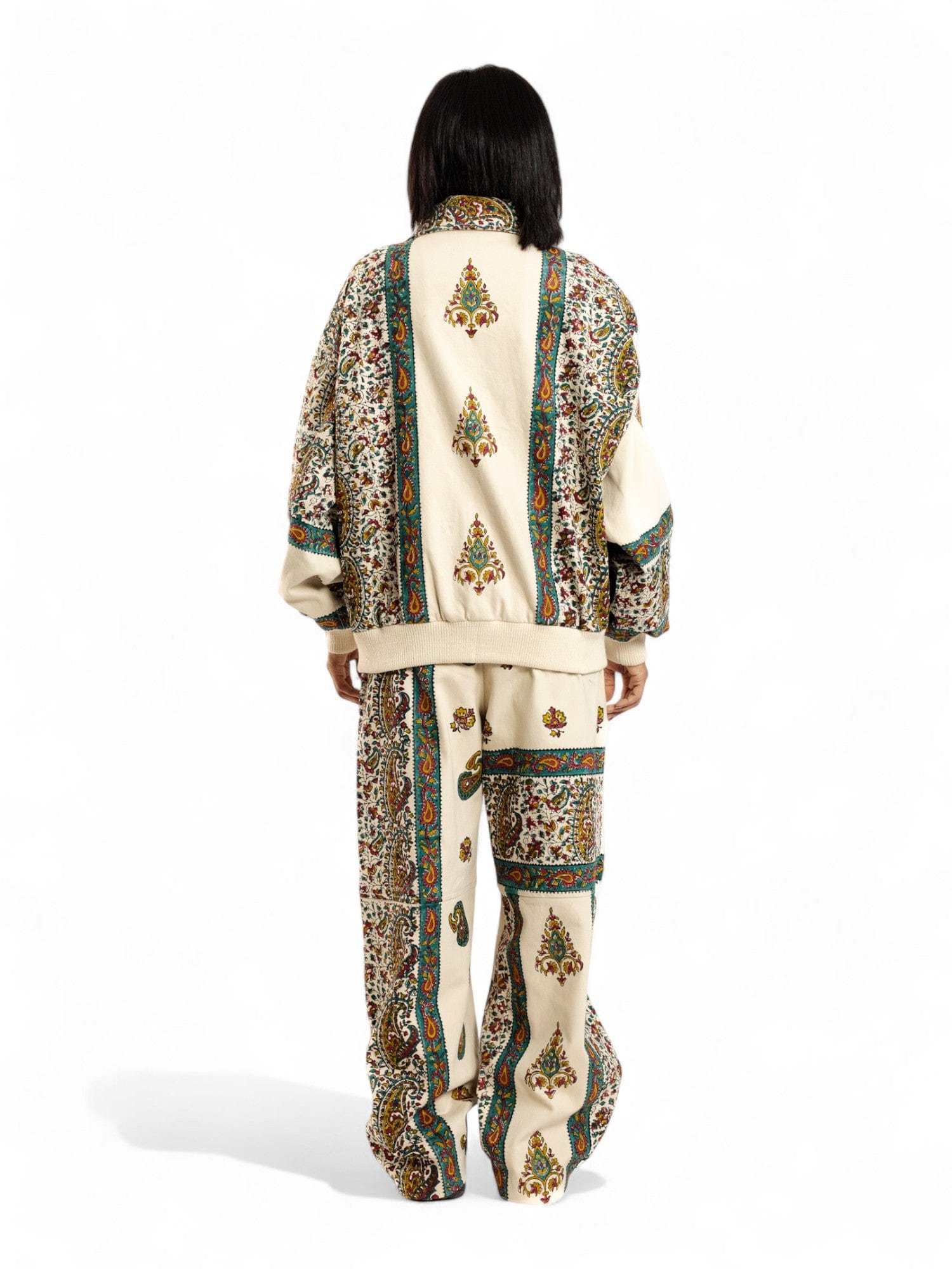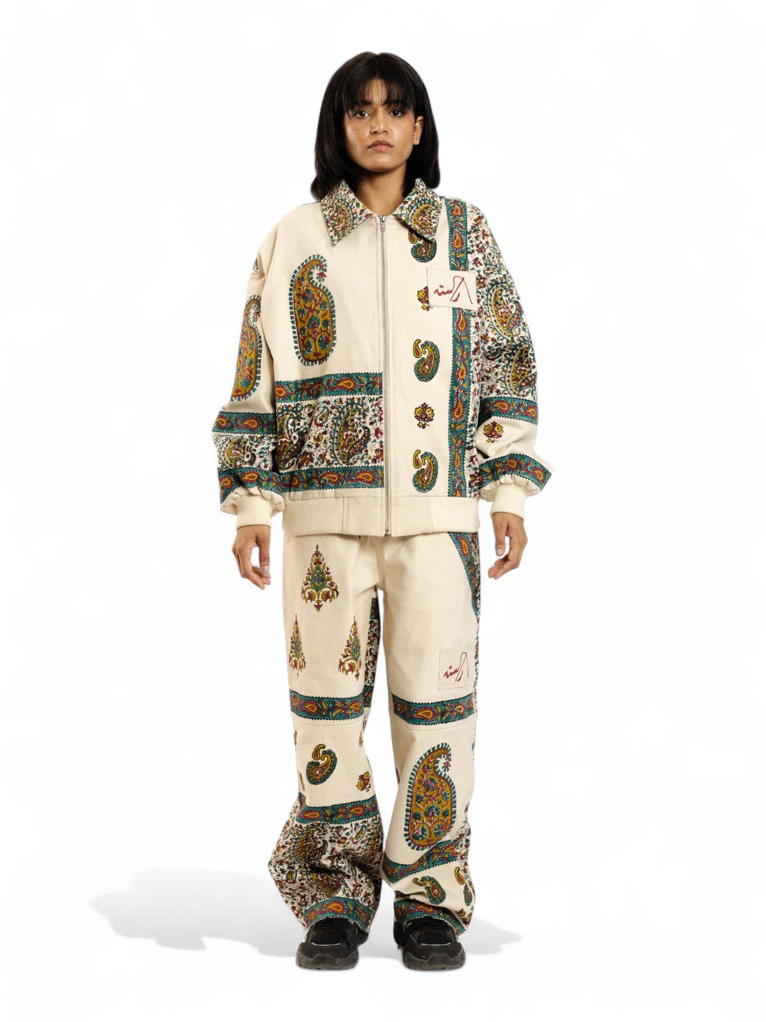 "95" BEIGE BLOCK PRINT BOMBER JACKET