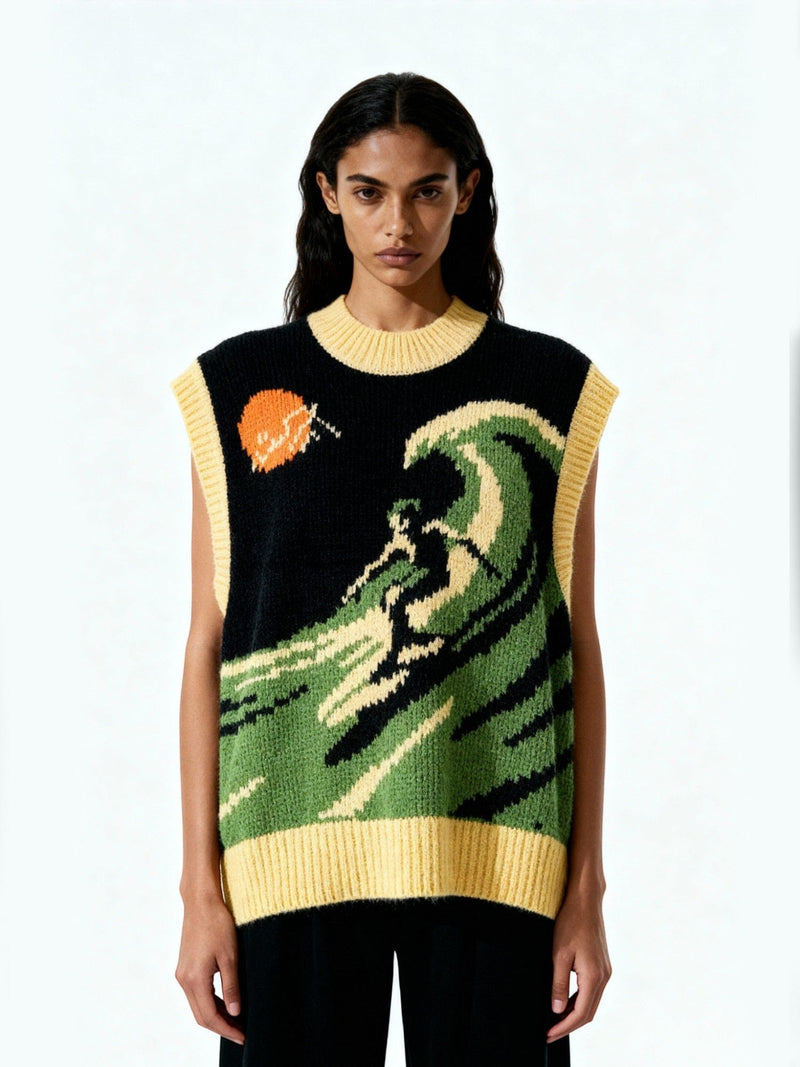 The Surfing Vest introduces global youth culture into Rastah’s knitwear narrative. Made with a blend of acrylic, nylon, and woolen thread, it features a stylized surfer motif woven through intarsia, celebrating motion and modern craftsmanship.
