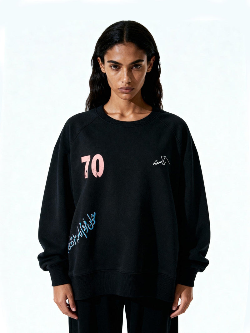 Made from soft, heavyweight fleece, it features front and back screen prints — the front bearing minimalist Urdu text and the number “70,” while the back showcases a large passport-stamp-inspired graphic layered with the Rastah logo. The blend of pastel tones against the deep black base evokes a sense of cultural identity and contemporary streetwear sensibility.