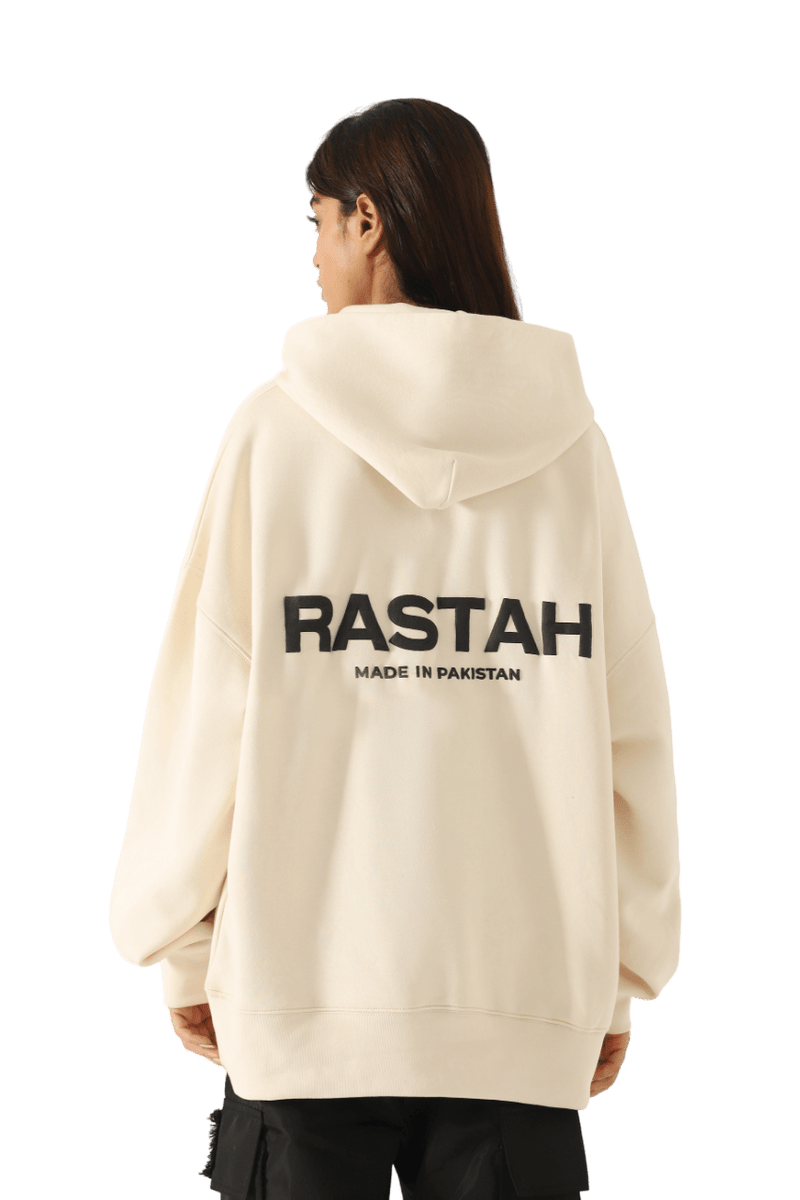 The beige Rastah Logo Hoodie subtly highlights the brand, featuring an Urdu Rastah logo puff printed on the front and an English logo alongside "Made in Pakistan" on the back. Made from a 500 GSM, 100% cotton blend, it ensures an oversized, comfortable fit.