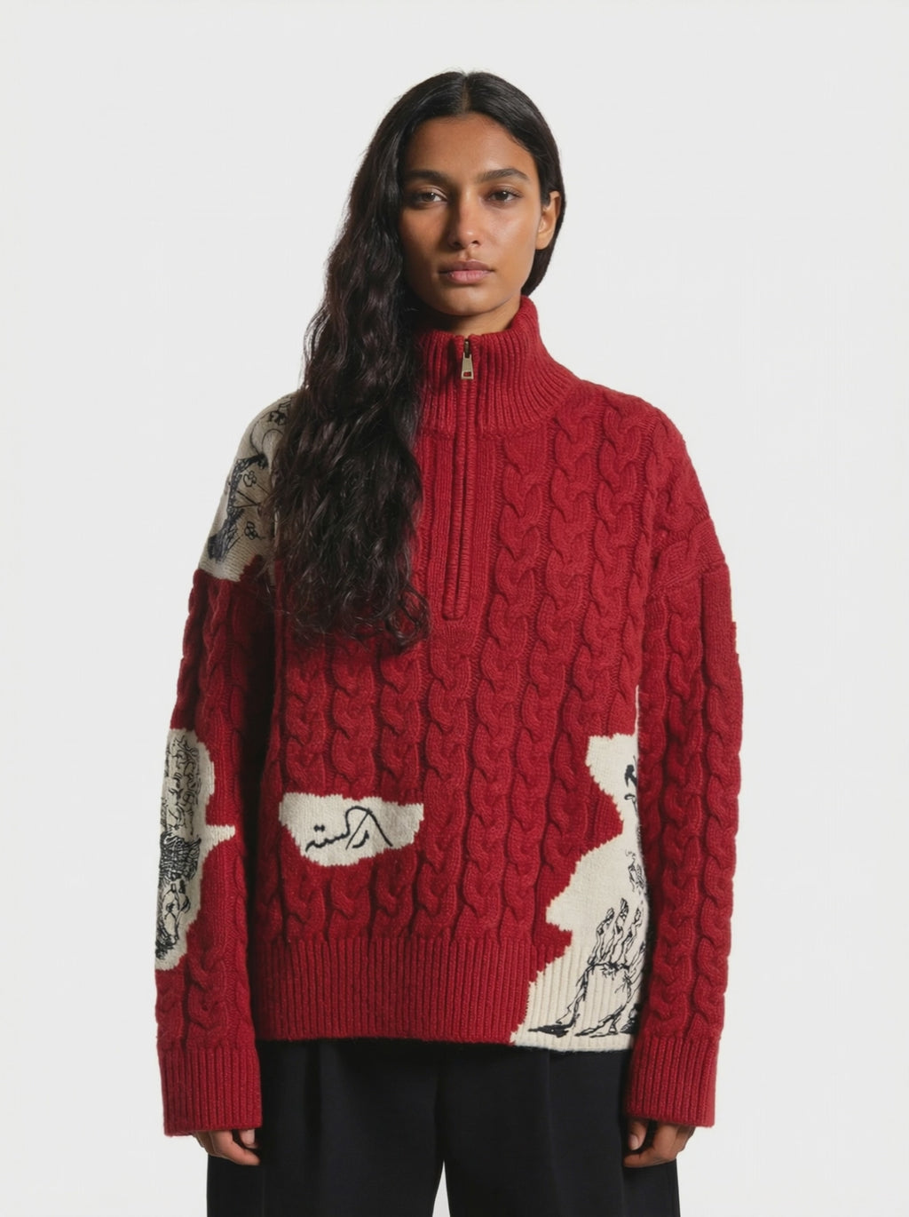 Crafted in a rich red cable-knit base, this piece features contrasting panels adorned with multi-head embroidery — including hand-drawn illustrations and flowing Urdu script that echo themes of freedom and reflection.