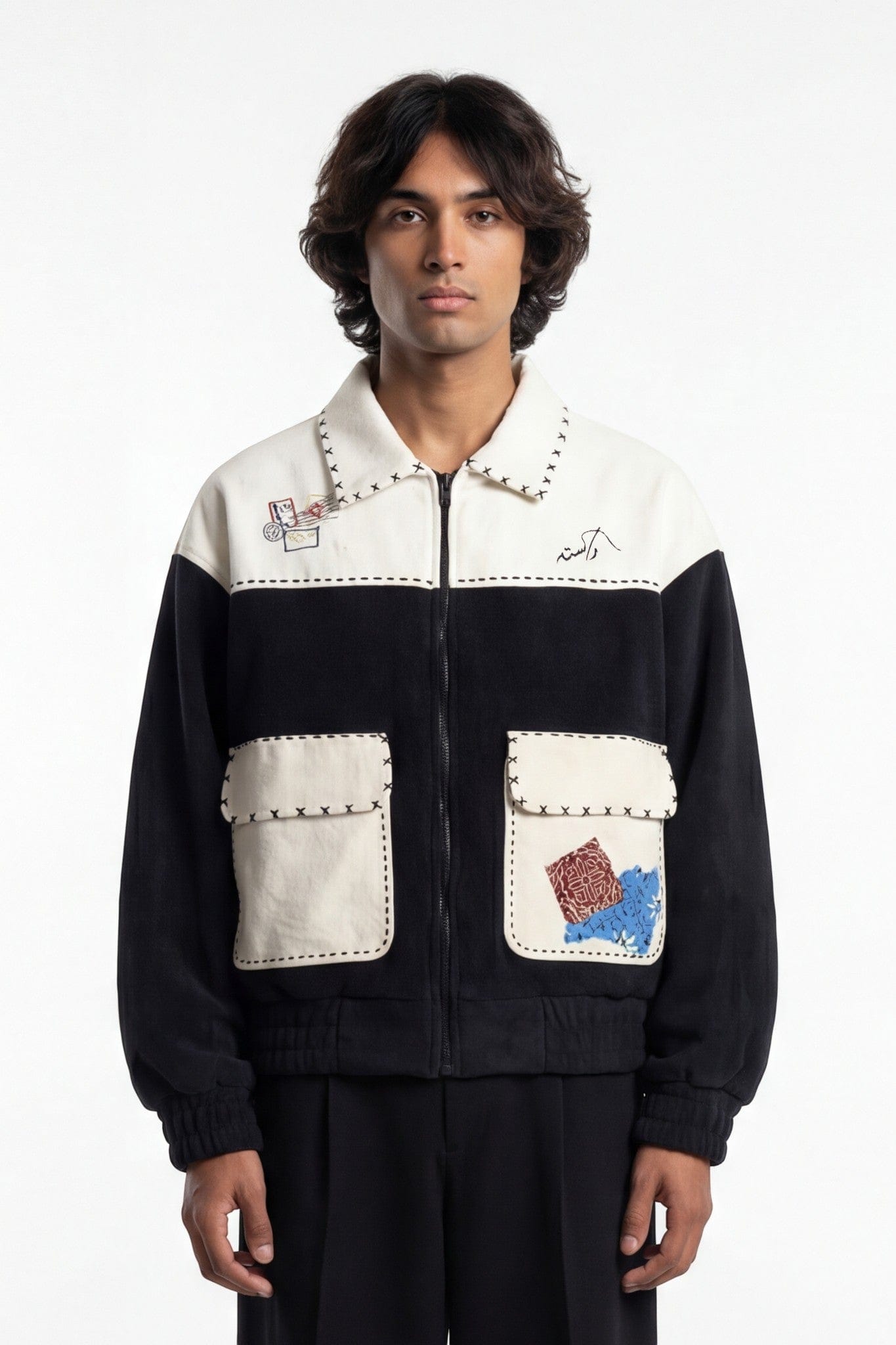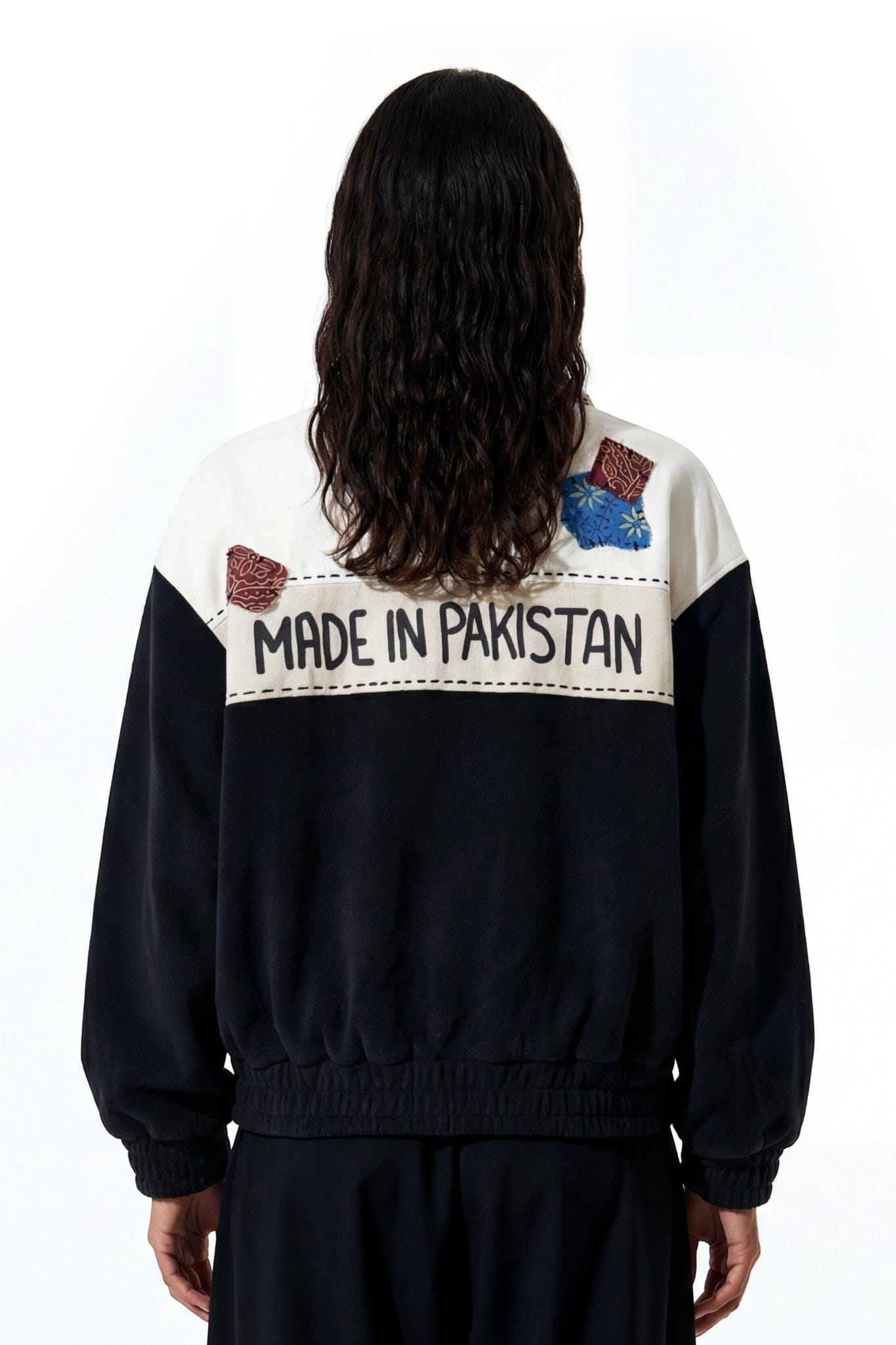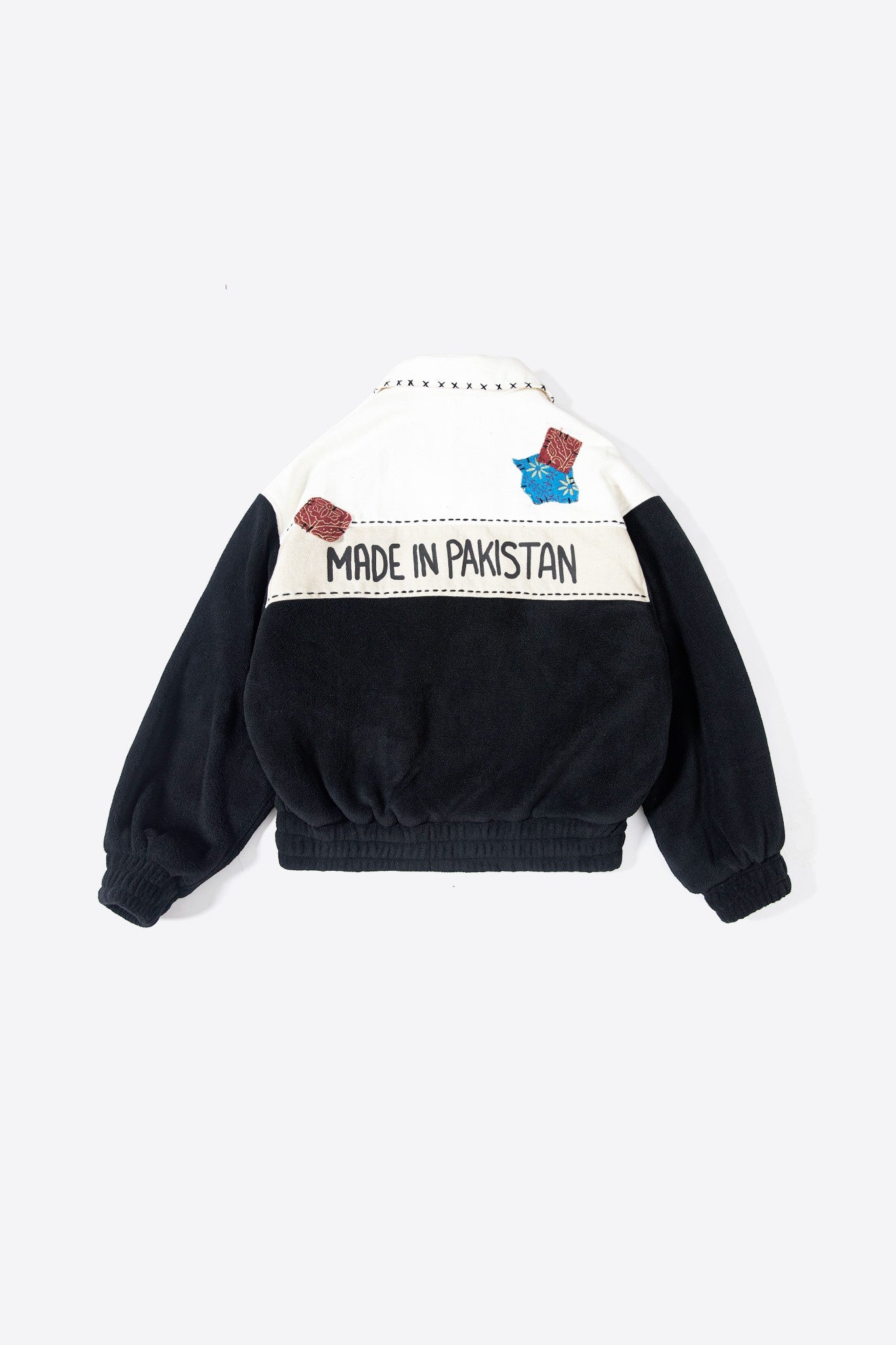 The Made in Pakistan Bomber Jacket is a bold expression of craft, culture, and construction. Built in a structured bomber silhouette, this piece combines sherpa-textured paneling with denim contrast for a layered, utility-driven look.
