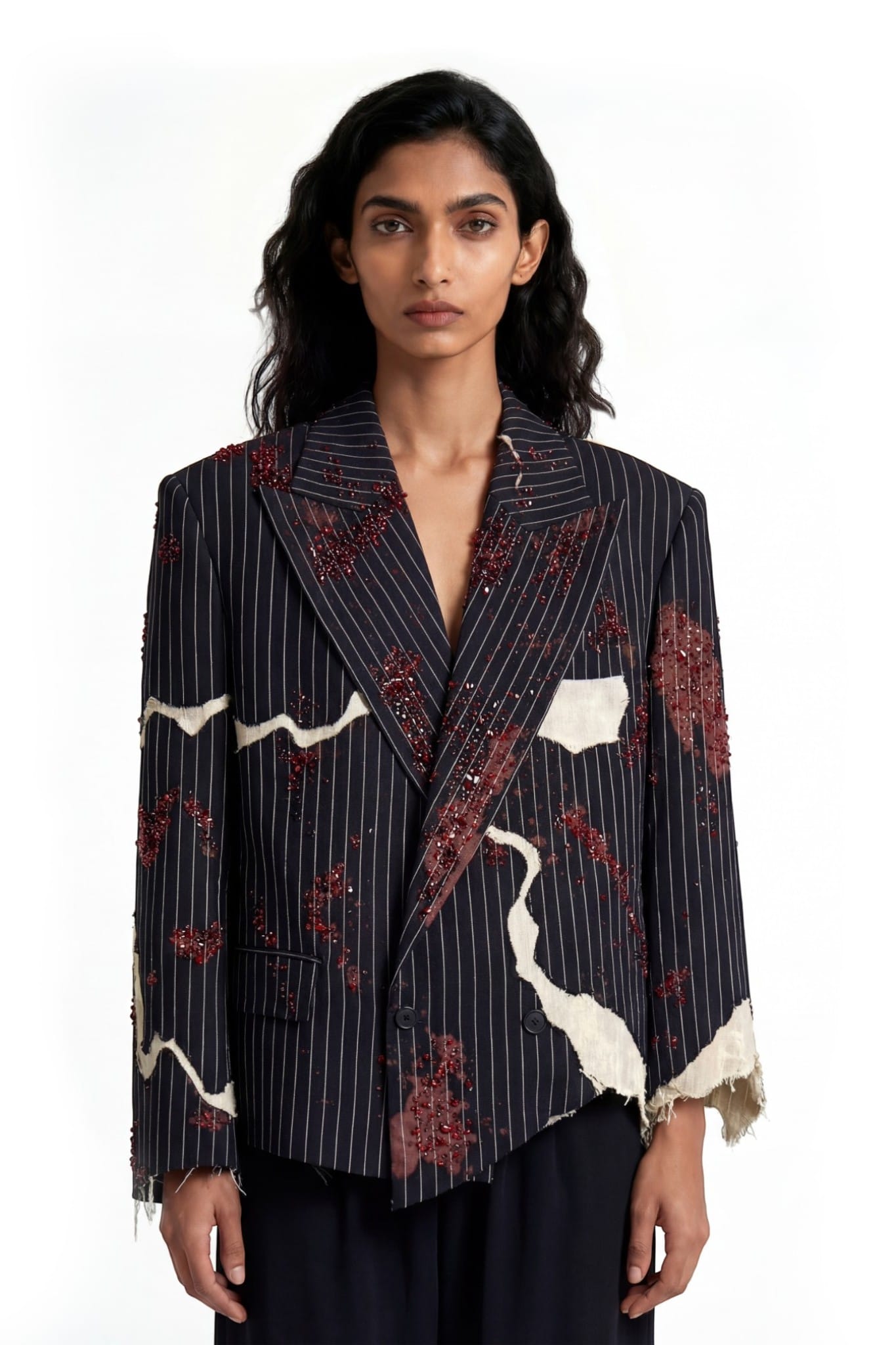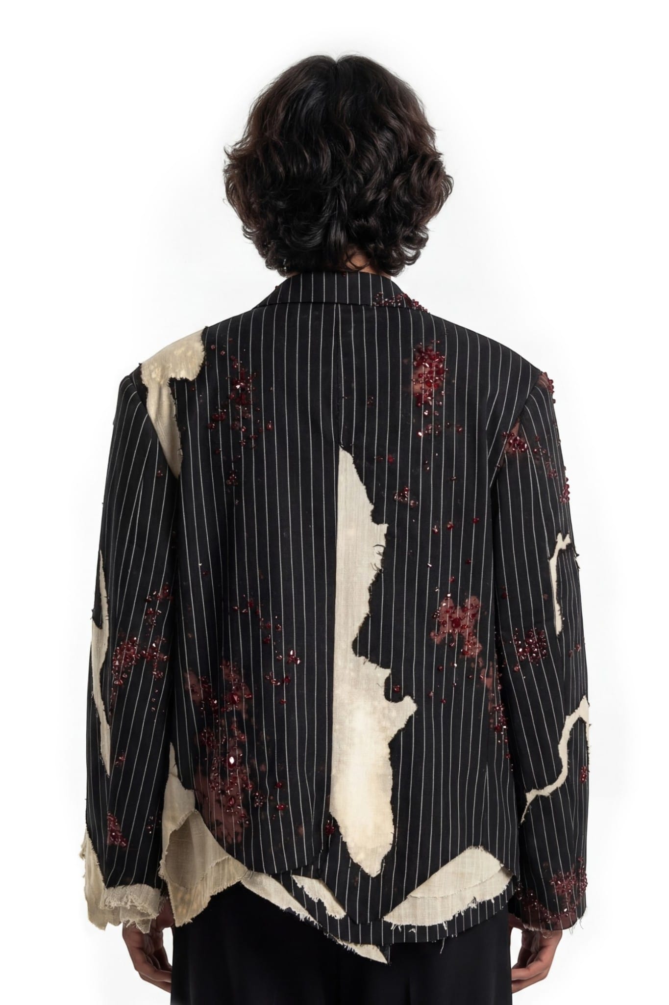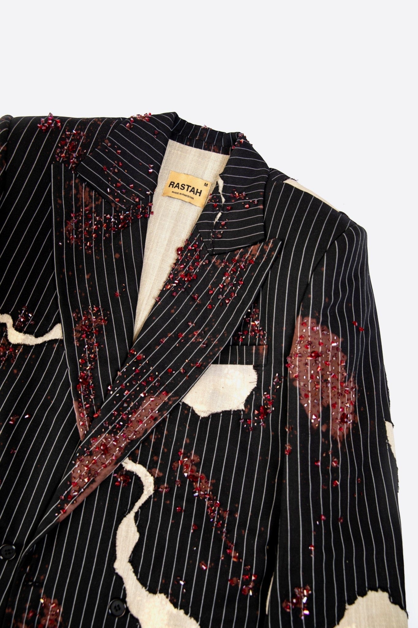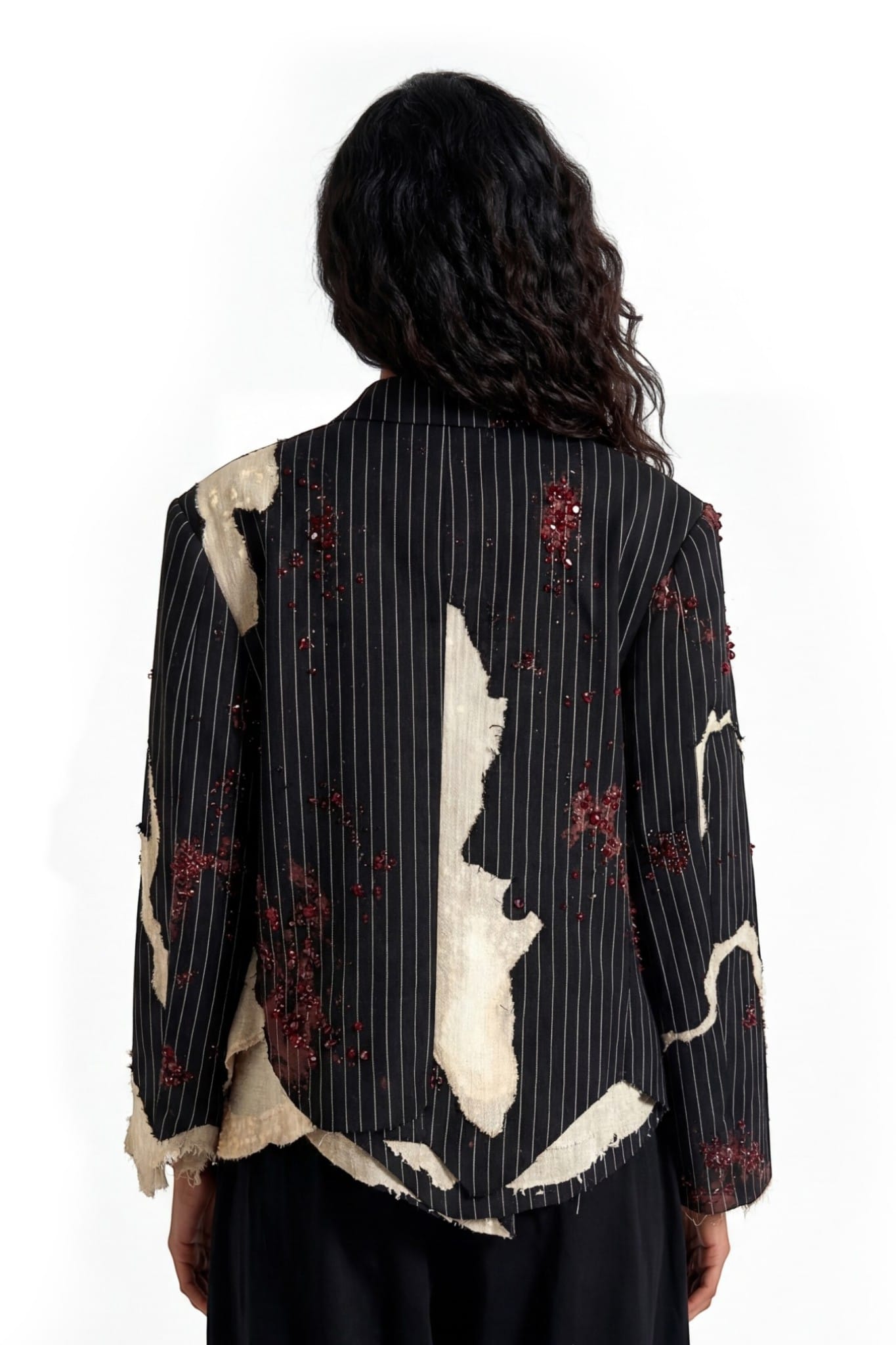 A pinstriped tailored jacket designed with a deconstructed, asymmetric silhouette and a cropped fit. Crafted from black pinstripe suiting fabric, the structure is disrupted by layered khaddar panels with raw, frayed edges. Bleached spray effects create a worn, clouded surface, adding depth to the garment. Hand-applied crystal and cutdana embellishments introduce subtle shine, balancing classic tailoring with an experimental finish.