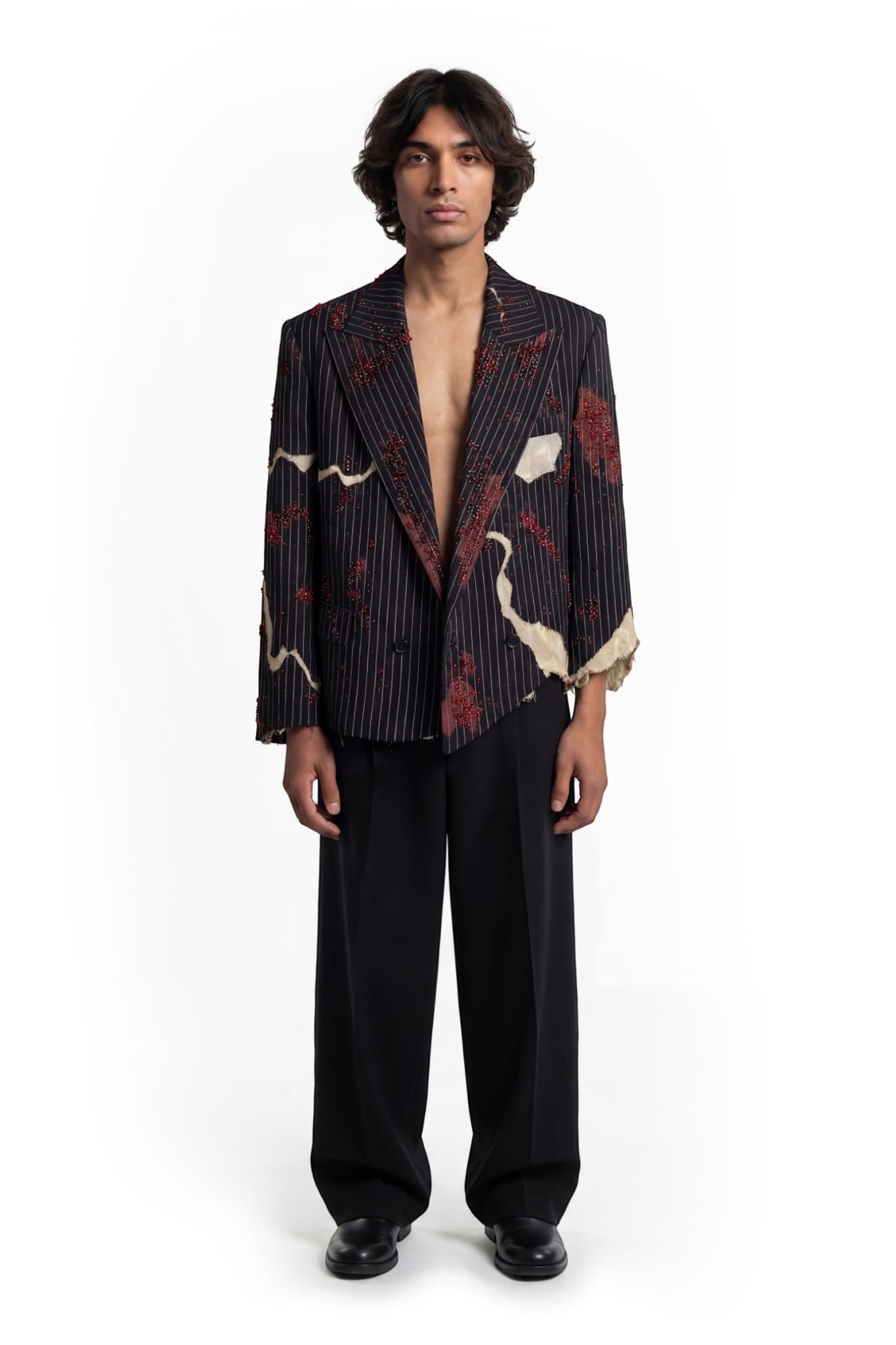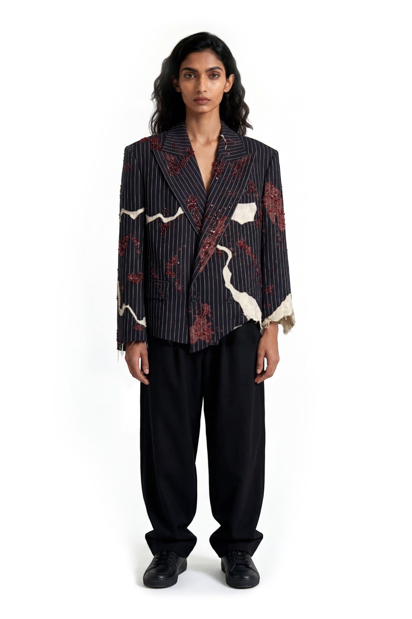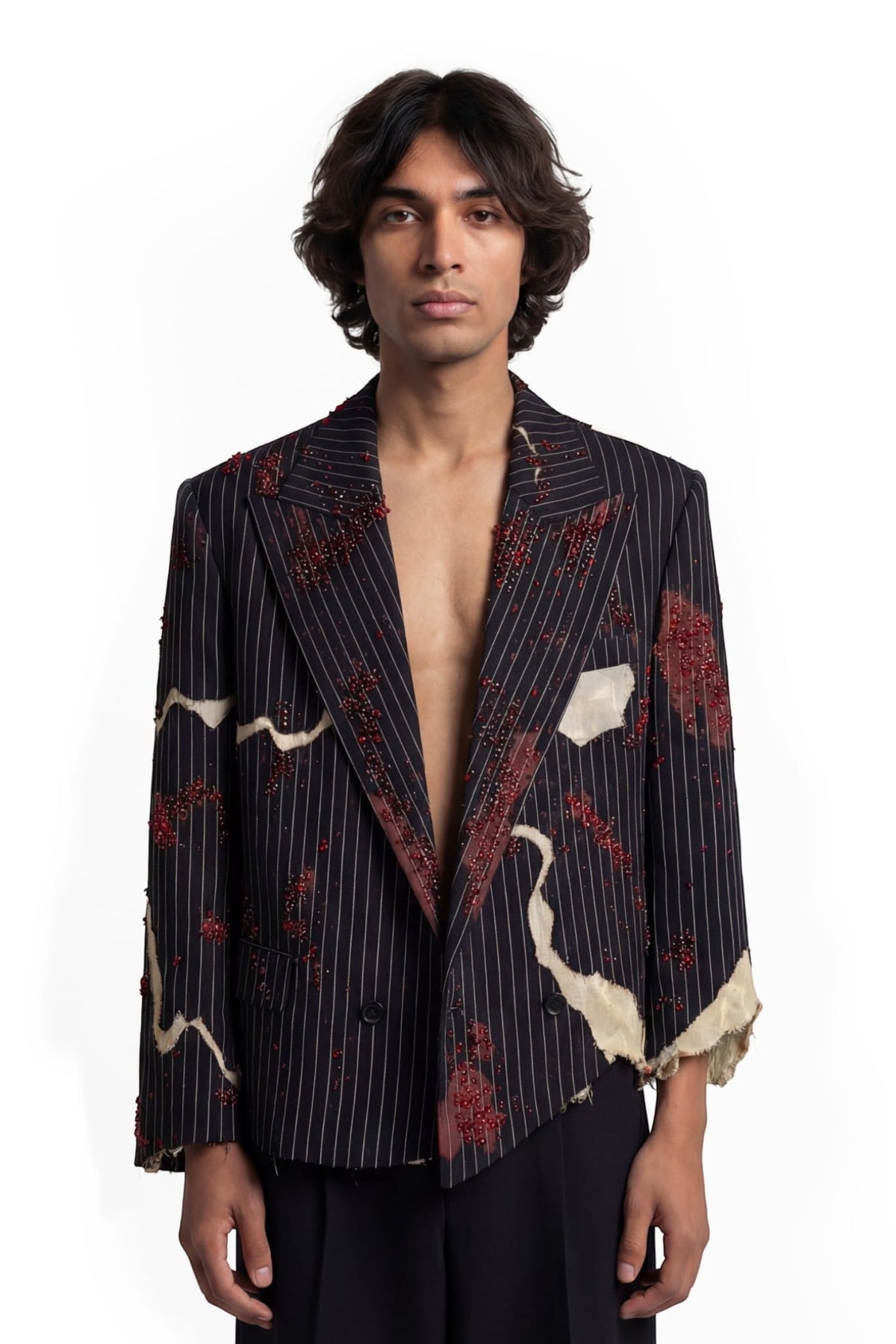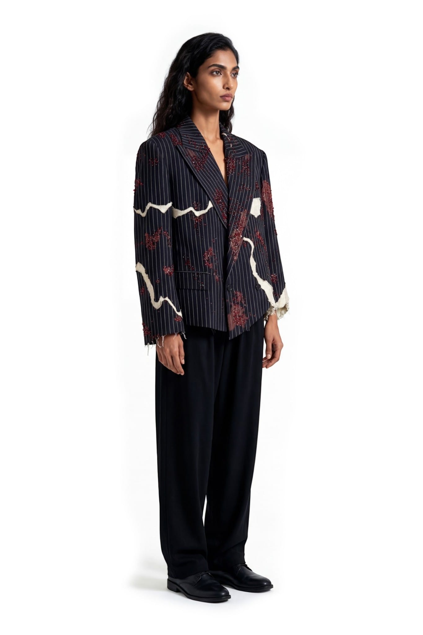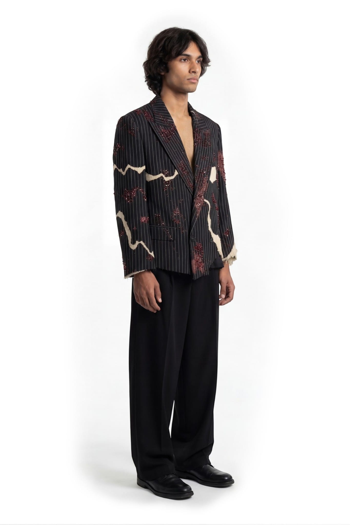 A pinstriped tailored jacket designed with a deconstructed, asymmetric silhouette and a cropped fit. Crafted from black pinstripe suiting fabric, the structure is disrupted by layered khaddar panels with raw, frayed edges. Bleached spray effects create a worn, clouded surface, adding depth to the garment. Hand-applied crystal and cutdana embellishments introduce subtle shine, balancing classic tailoring with an experimental finish.