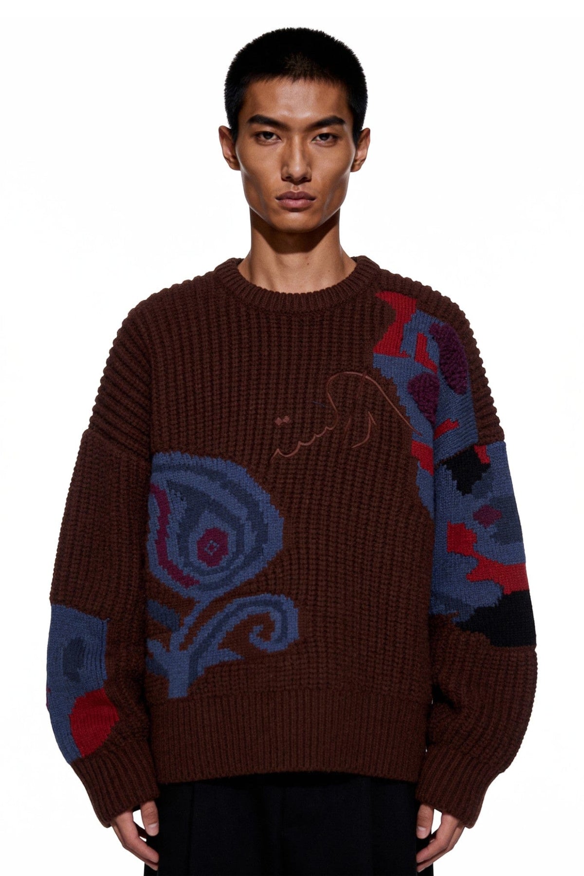 A Wall That Still Breathes is a textured knit inspired by aging walls, faded murals, and the warmth trapped within old structures. Crafted in a rich brown jacquard base, the sweater features knitted motifs and tufted detailing that feel worn-in yet alive. Embroidered logo adds a subtle touch, making the piece feel less manufactured and more remembered.