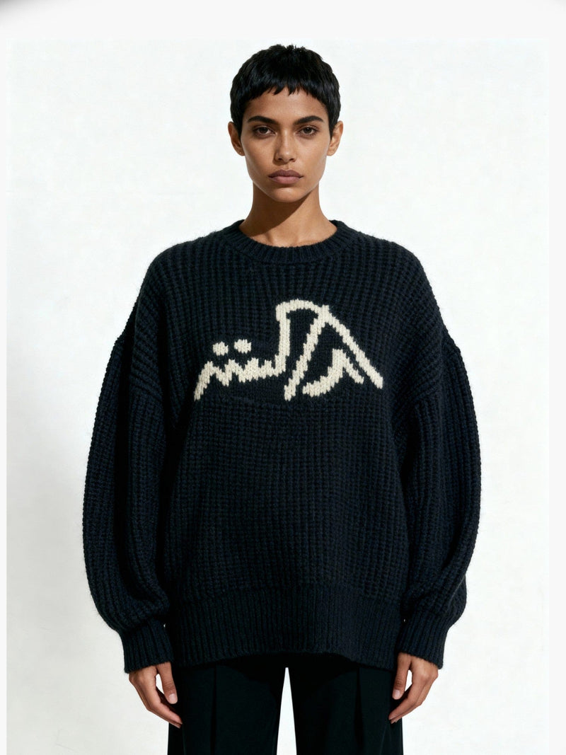 The Black Made in Pakistan Sweater mirrors its navy counterpart in a deeper tone, emphasizing quiet strength and modern minimalism. Knitted from a blend of acrylic, nylon, and woolen thread, it features a bold Urdu “Made in Pakistan” motif in contrast yarn.