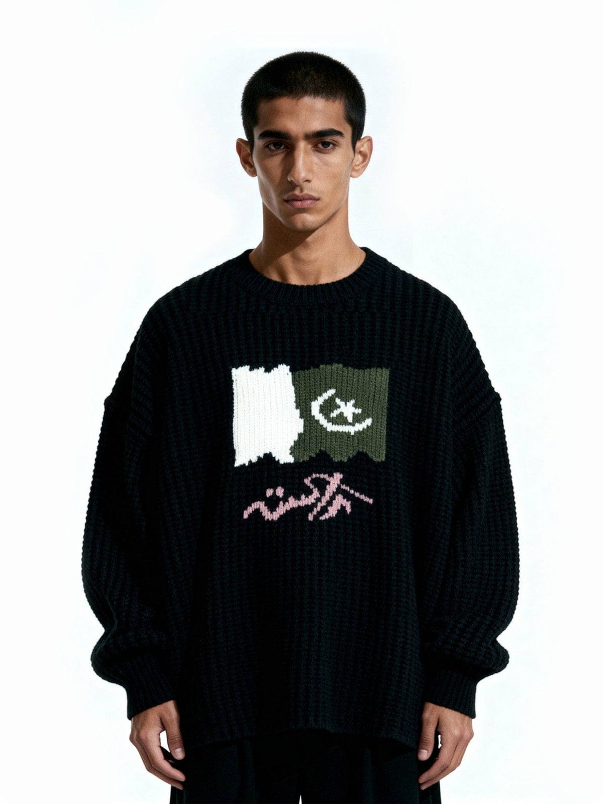 The Pakistan Flag Sweater pays homage to national heritage through subtle artistry. Made with a blend of acrylic, nylon, and woolen thread, it features a flag patch and Urdu text detail at the chest.