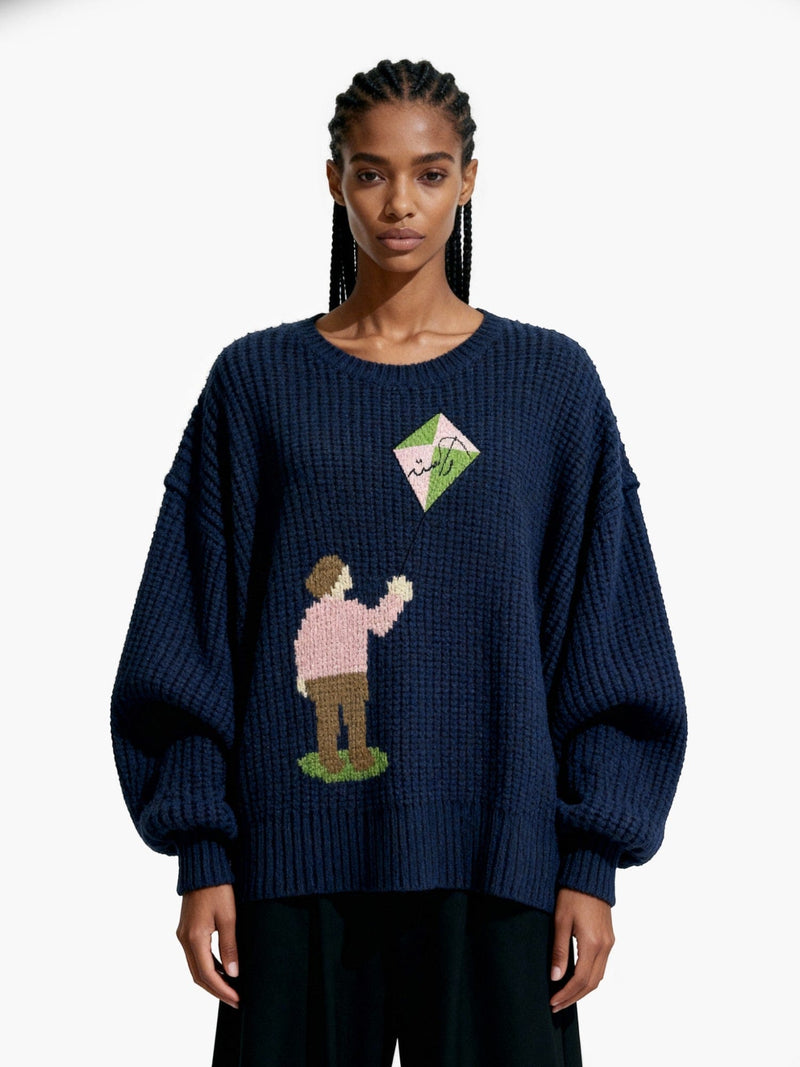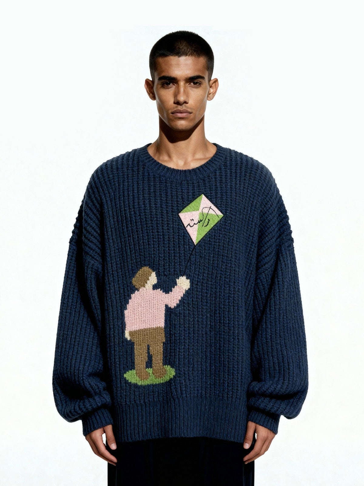 The Kite Sweater captures the innocence and nostalgia of Pakistani winters through an intricately knitted kite motif. Crafted using a blend of acrylic, nylon, and woolen thread, it features textured intarsia art and a relaxed silhouette.