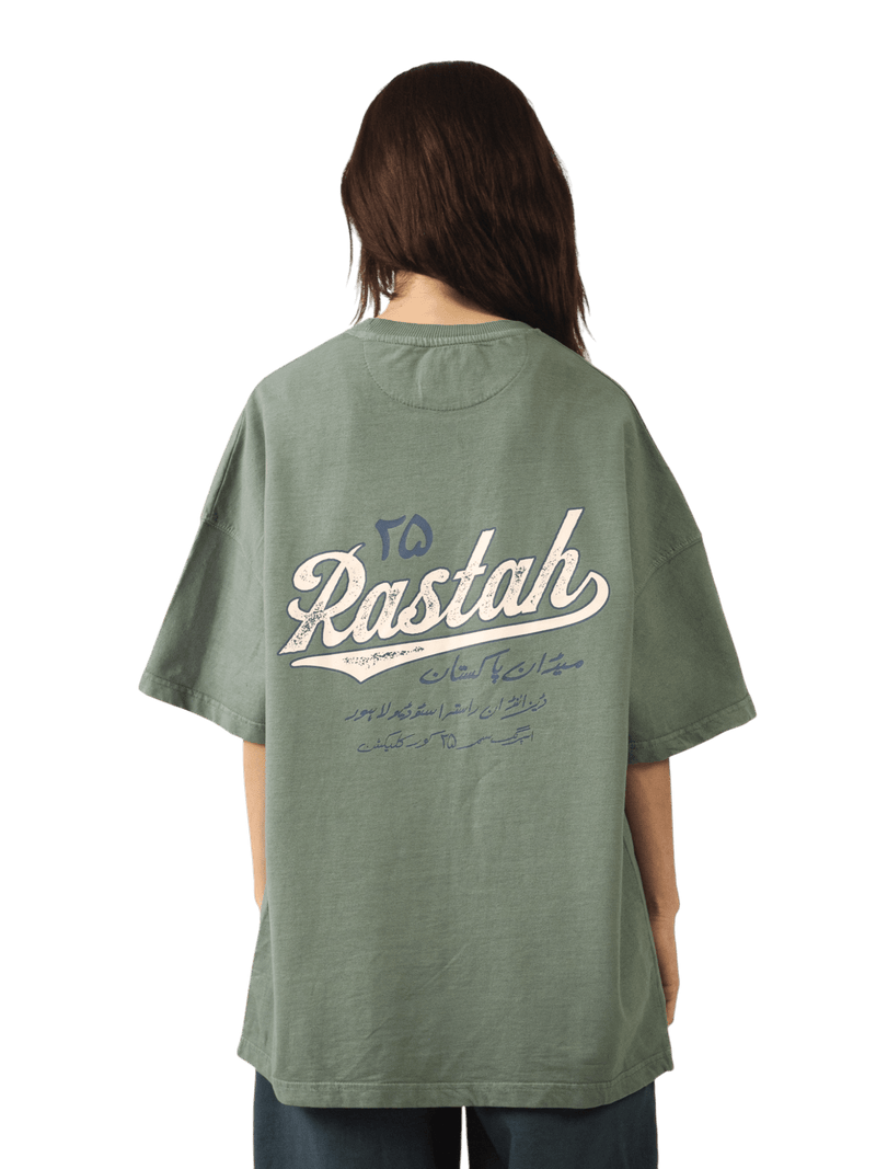 An oversized t-shirt crafted from 100% cotton terry fabric in a Green tone. Featuring a minimal screen-printed Urdu logo on the front and a bold bilingual screen print on the back, it blends cultural expression with streetwear ease.