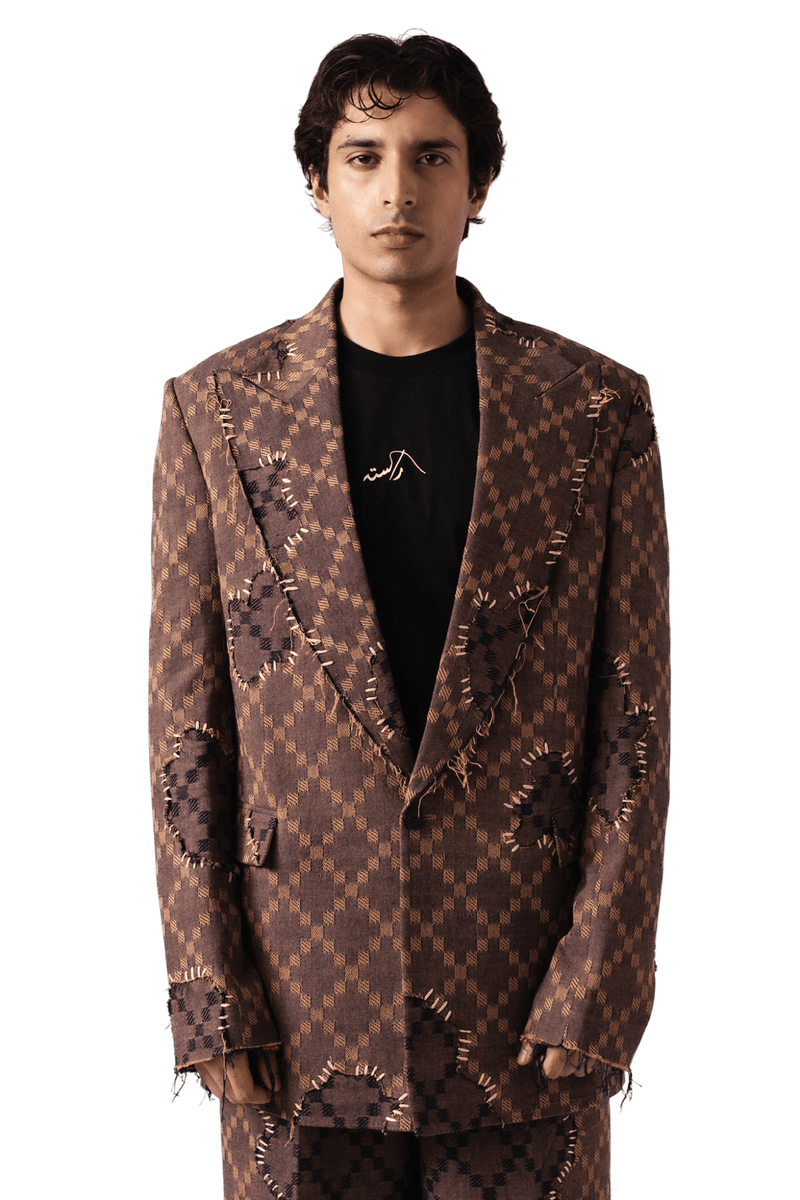 A bold reinterpretation of traditional craftsmanship, this dobby fabric blazer blends heritage weaving with contemporary deconstruction. Hand-stitched raw paneling overlays the checkered base, creating depth and dimension while celebrating imperfection as art. The oversized silhouette, sharp lapels, and intricate fashion stitching pay homage to artisanal craft while pushing forward into modern design.