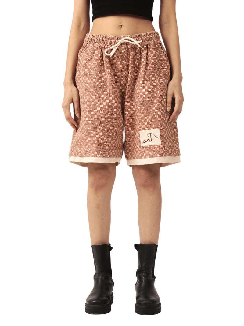 These handwoven dobby jacquard shorts in a rich rust tone are elevated with a soft beige contrast hem and drawstring waist. Featuring a relaxed silhouette and a statement woven patch on the leg, the texture-rich weave draws inspiration from traditional loom artistry, reimagined for modern comfort and form.