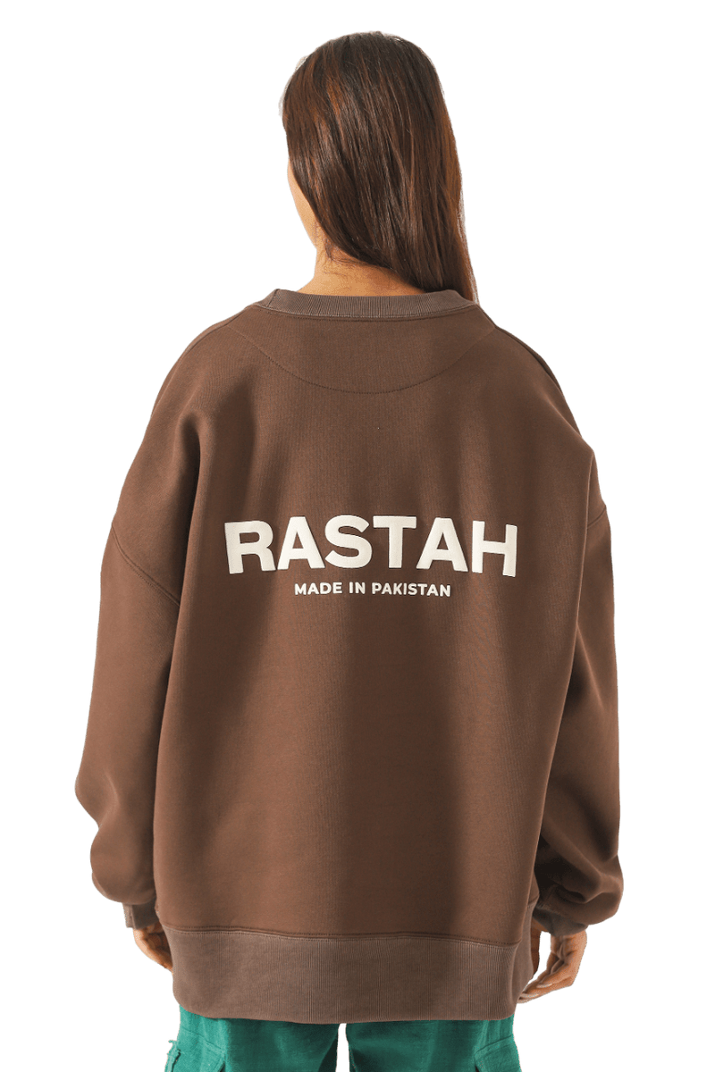 The brown Rastah Logo Sweatshirt captures a minimalist style, with just the Urdu Rastah logo puff printed on the front. Composed of 100% cotton blend, its 420 GSM weight delivers an oversized, relaxed silhouette.