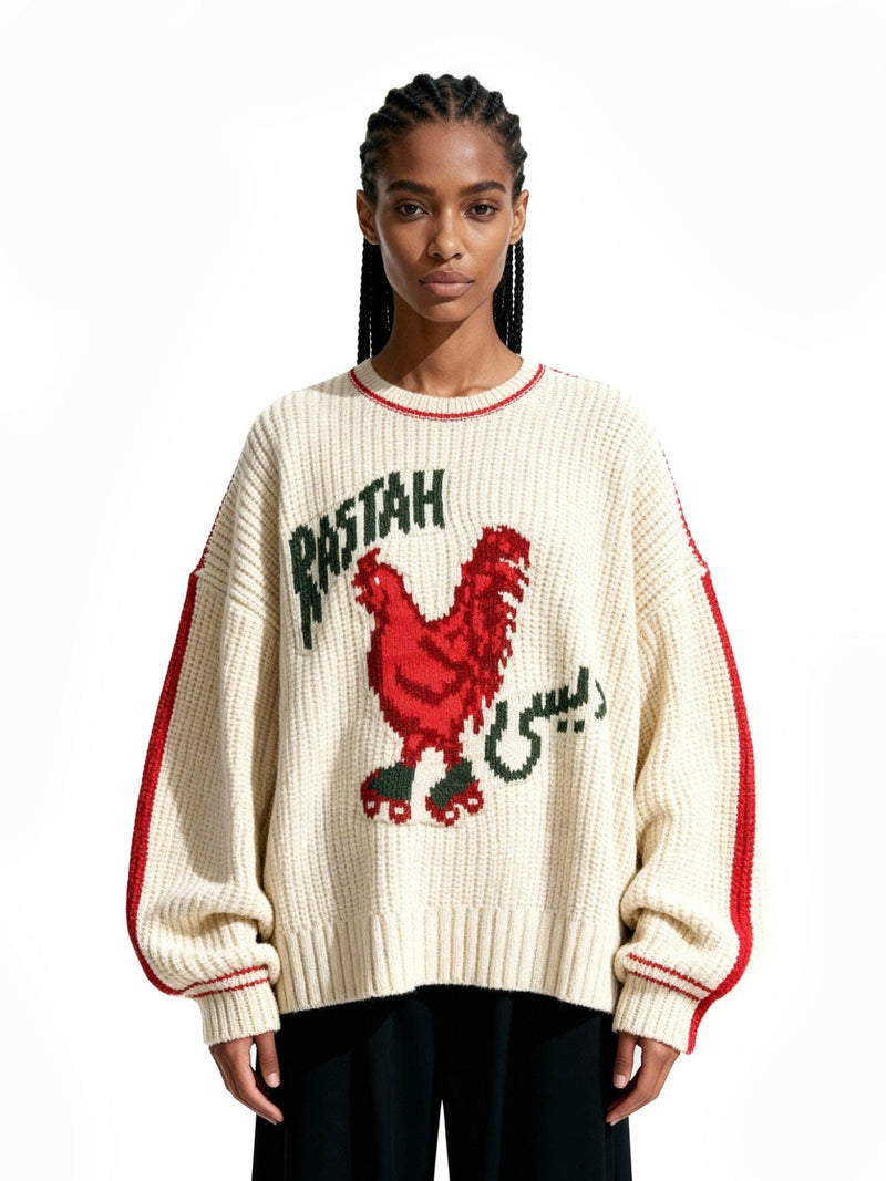 The Desi Chicken Sweater combines humor, culture, and craft. Knitted with a blend of acrylic, nylon, and woolen thread, it showcases a bold rooster graphic with Rastah’s signature typography — a playful yet refined expression of cultural storytelling.