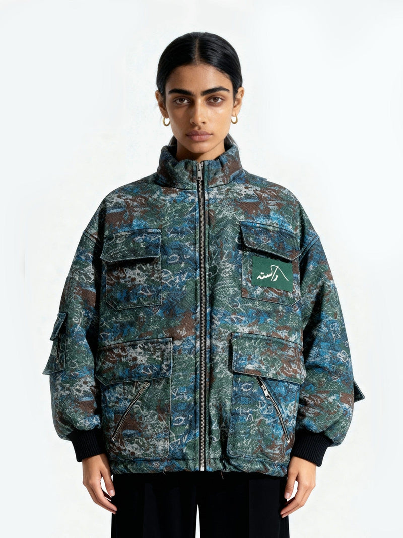 Crafted from printed polyester canvas and quilted for insulation, the jacket merges utilitarian function with abstract artistry. The pattern echoes satellite imagery and map textures—chaotic yet deliberate. Finished with multiple utility pockets, a high-collared silhouette, and a screen-printed Rastah logo patch on the chest, it stands as a modern study of structure and disarray.