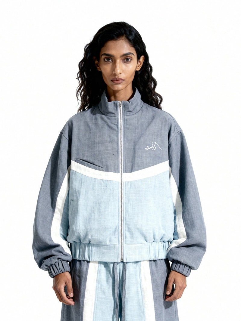 Constructed from handwoven khaddar, the piece features a quilted inner layer and curved panel detailing that merges structure with softness. A screen-printed logo marks the chest and back, grounding the jacket in Rastah’s visual identity. Finished with elasticated hems and cuffs, this bomber offers comfort, warmth, and a distinctly refined silhouette.