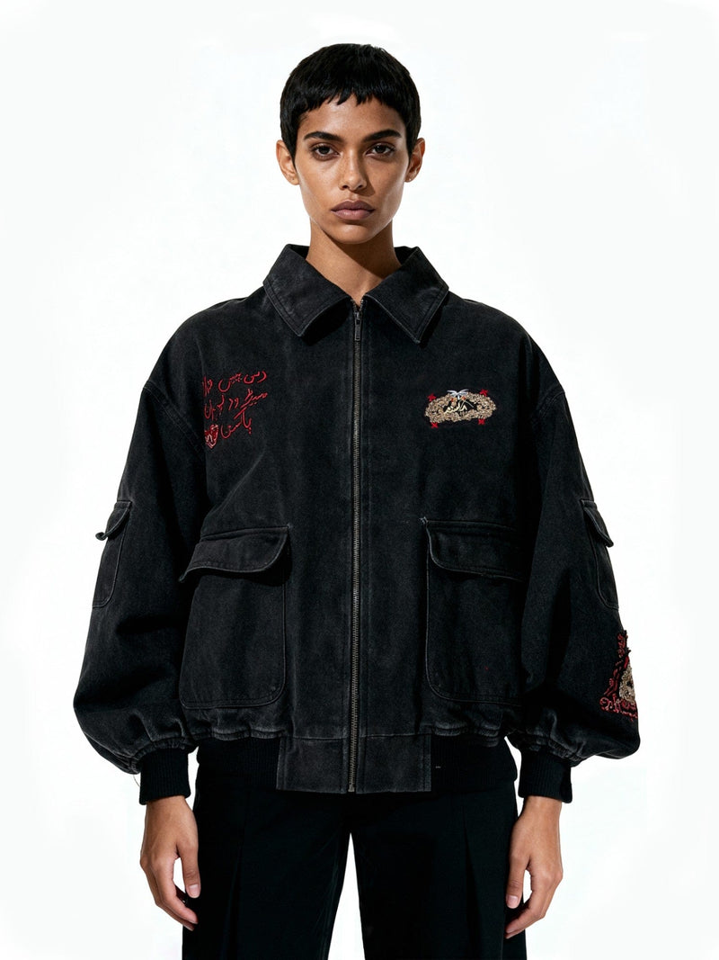 Featuring a hand-made dabka embroidery Rastah logo patch on the front, it honors traditional embroidery techniques while maintaining a modern streetwear silhouette. Hand-embroidered Urdu text reading “Made with love in Pakistan” appears alongside screen-printed and hand-applied Sindhi Ajrak patches on the front and sleeve. The fashion stitch detailing and acid wash treatment bring a distinct worn-in character, giving each piece a unique, lived texture.