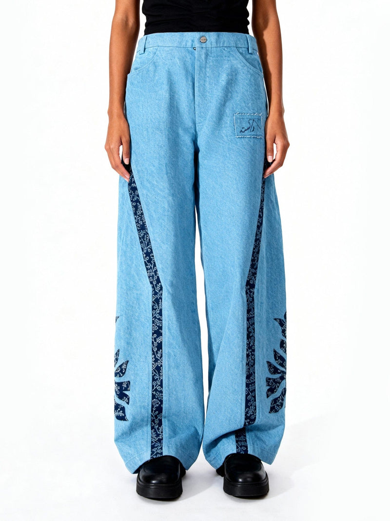 Crafted from washed denim, they feature hand-cut Sindhi indigo ajrak panels that flow down the legs, accented by laser-cut motifs inspired by native florals. A screen-printed logo patch on the front nods to Rastah’s contemporary craftsmanship, creating a timeless balance between heritage and modernity.
