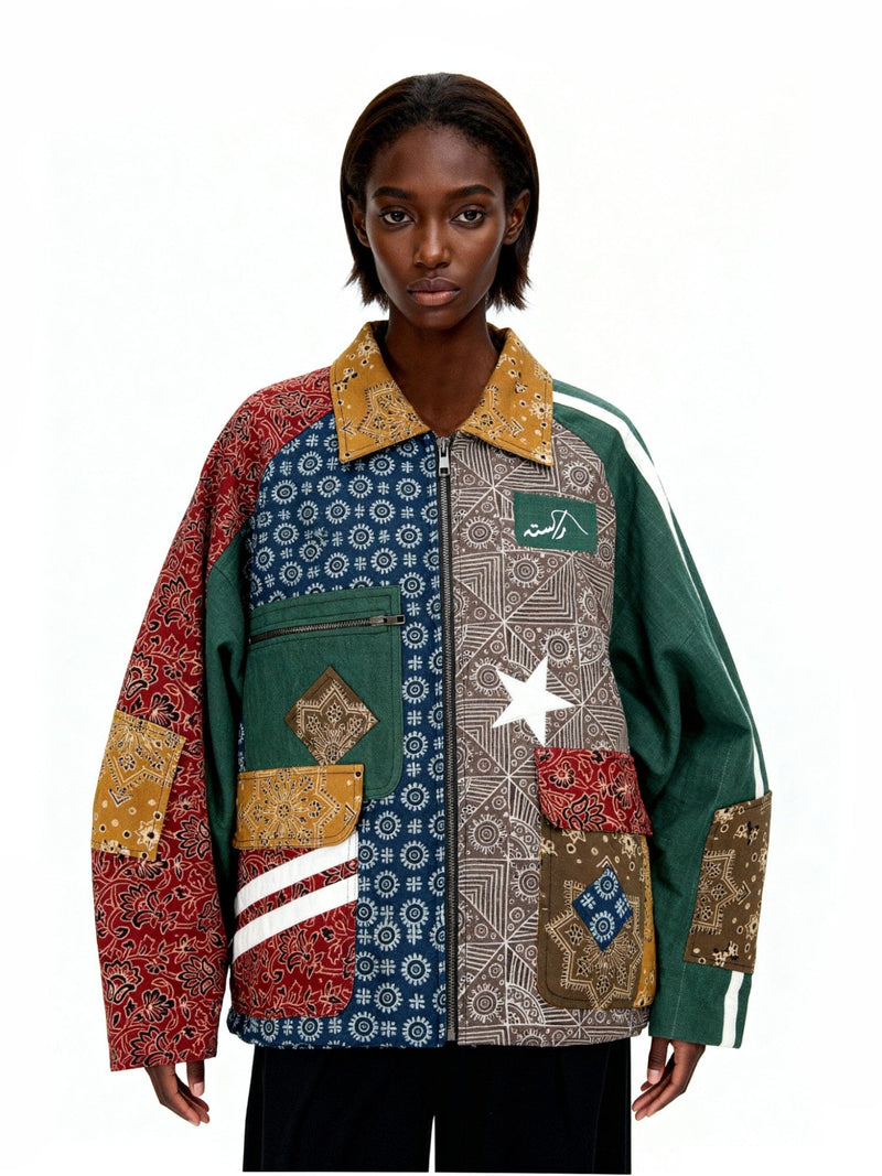 onlConstructed from panels of hand block-printed Sindhi Ajrak in varying colours, it is balanced with hand-dyed green khaddar inserts for depth and contrast. Each section carries its own narrative through traditional motifs and careful handwork. Finished with a screen-printed logo patch on the front, this piece merges the warmth of quilted craftsmanship with an expressive, contemporary silhouette.