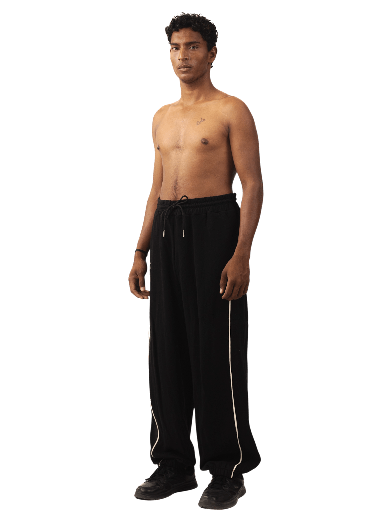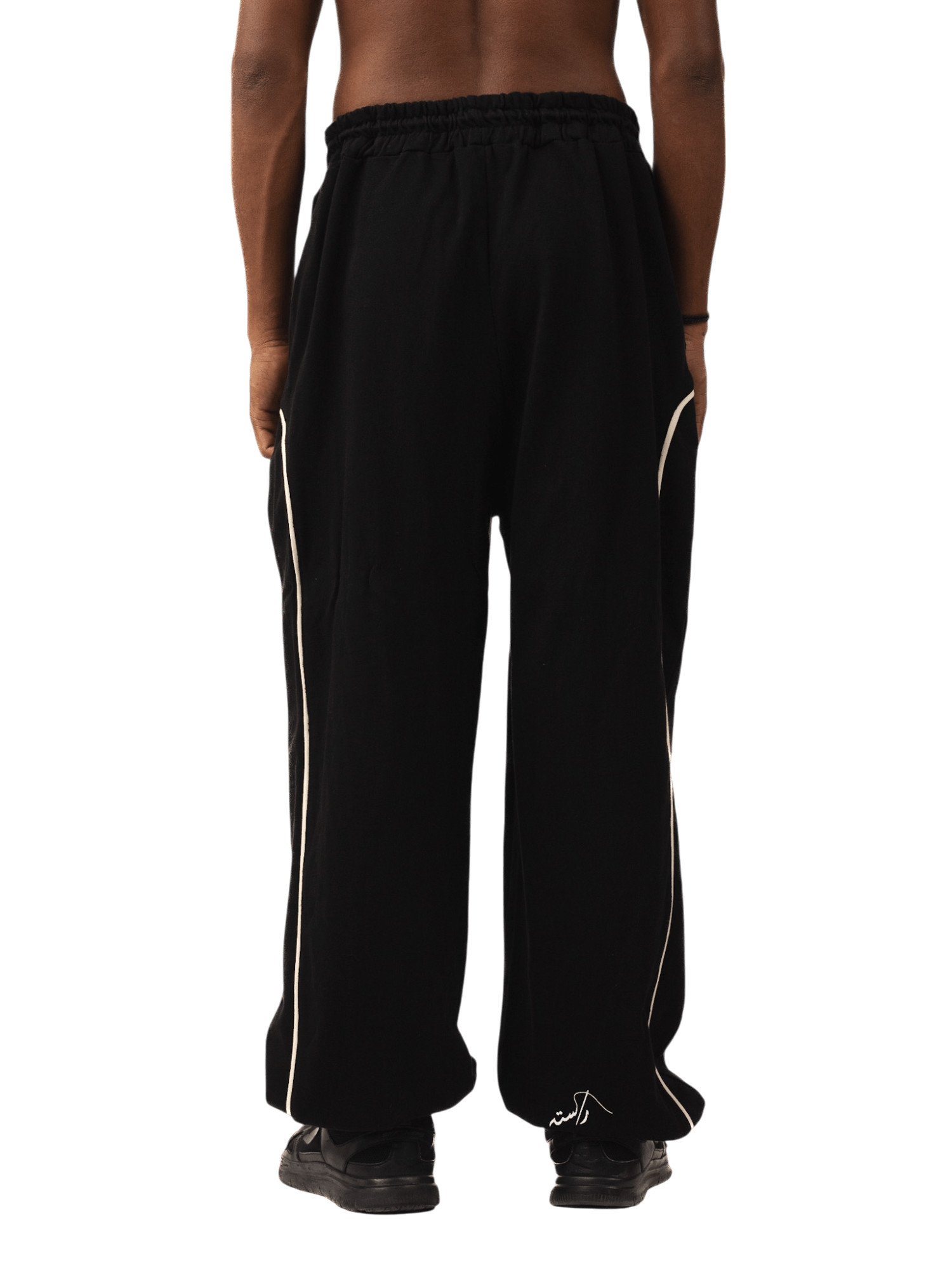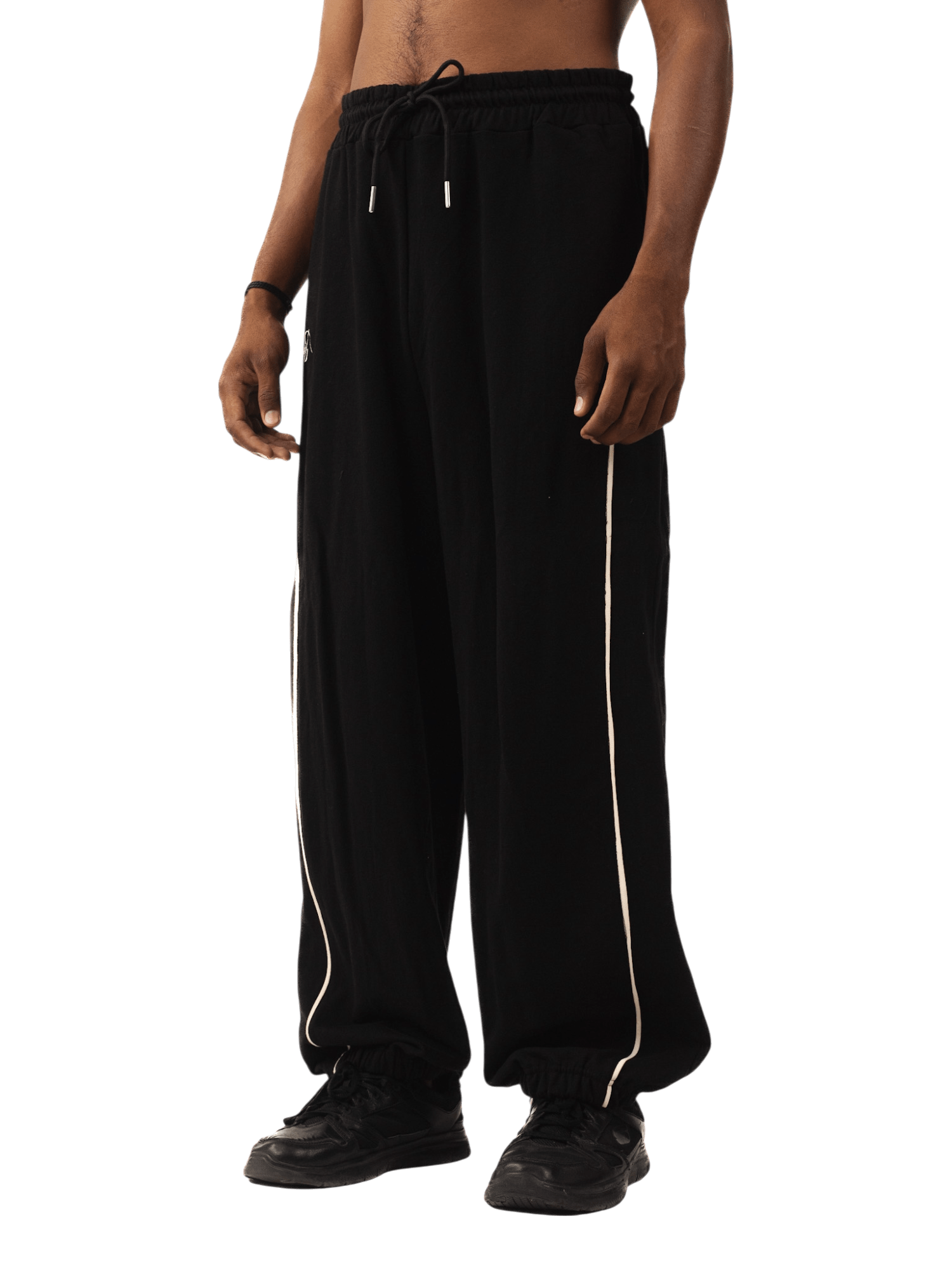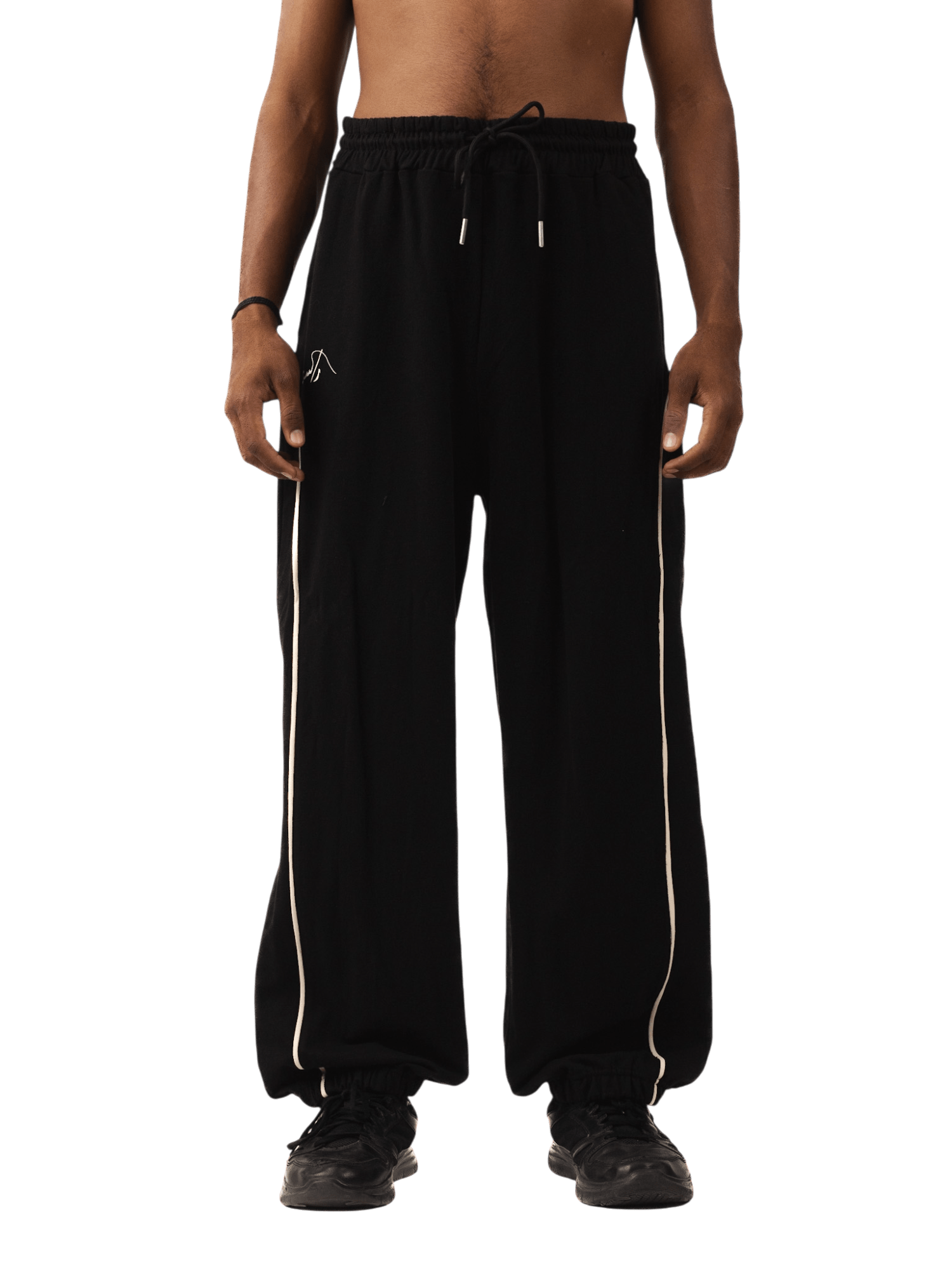 Crafted from soft black terry fabric, these relaxed-fit trousers feature an arched off-white stripe along the side seams, evoking a sense of movement and graphic minimalism. With a drawstring waist and wide-leg silhouette, they blend utility and sport, built for both flow and comfort.