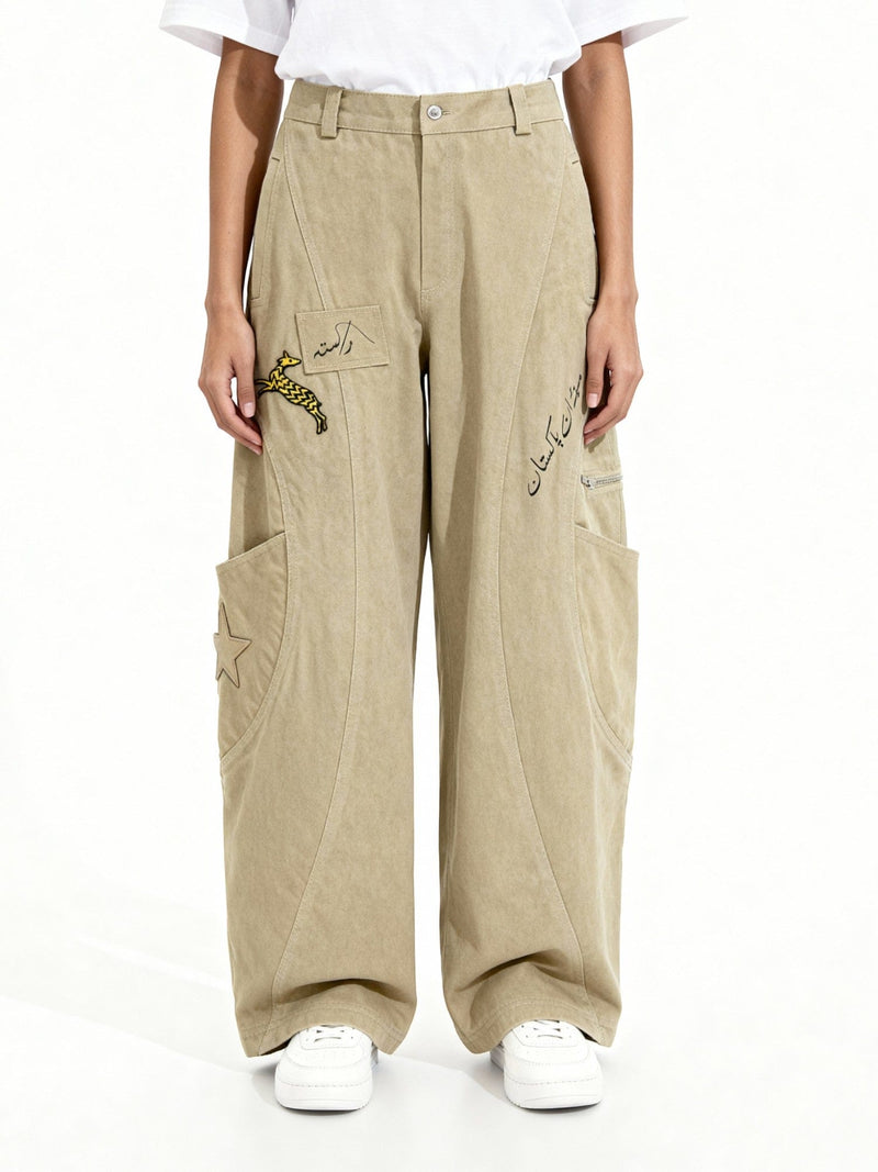 Crafted from heavy denim with curved panel detailing, these pants balance precision and rawness. The front features screen-printed Urdu text and an embroidered patch that nods to local identity and nostalgia. With exaggerated pocket structures and a wide-leg silhouette, they offer both function and form — a reinterpretation of traditional tailoring through modern craft.