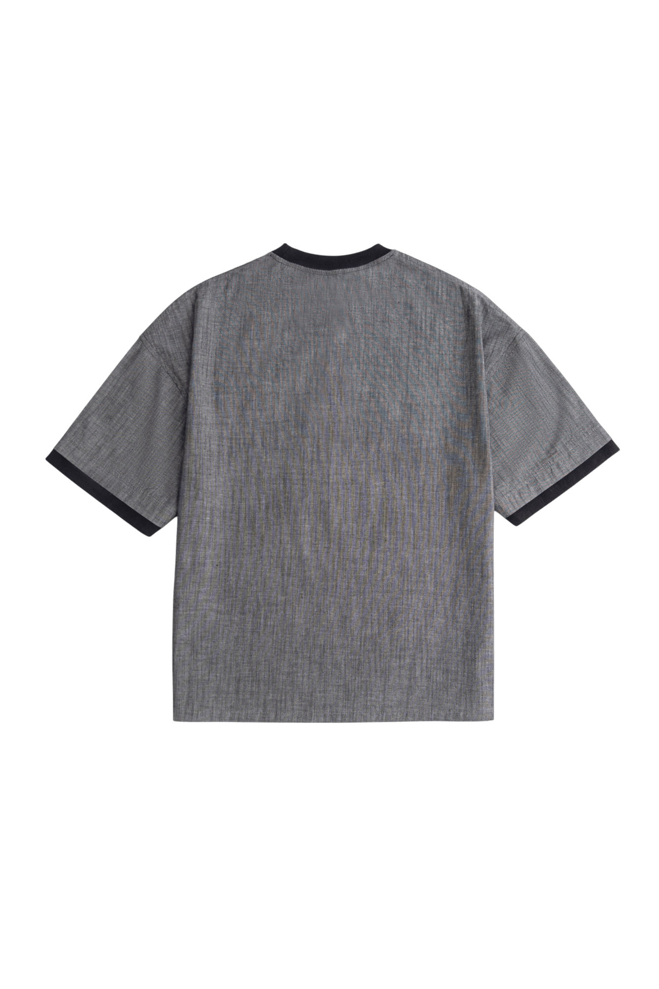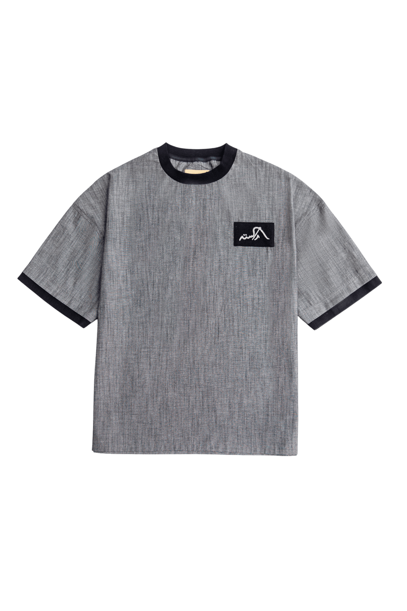 The Raakh Tee channels subtle sophistication through fine construction and tactile depth. Made from soft cotton shembarray fabric, this t-shirt showcases vertical slub textures in a cool ash-grey tone. The body is cut in a relaxed, boxy silhouette that drapes naturally, with black khaddar contrast ribbing on the neckline and sleeve cuffs for tonal structure.