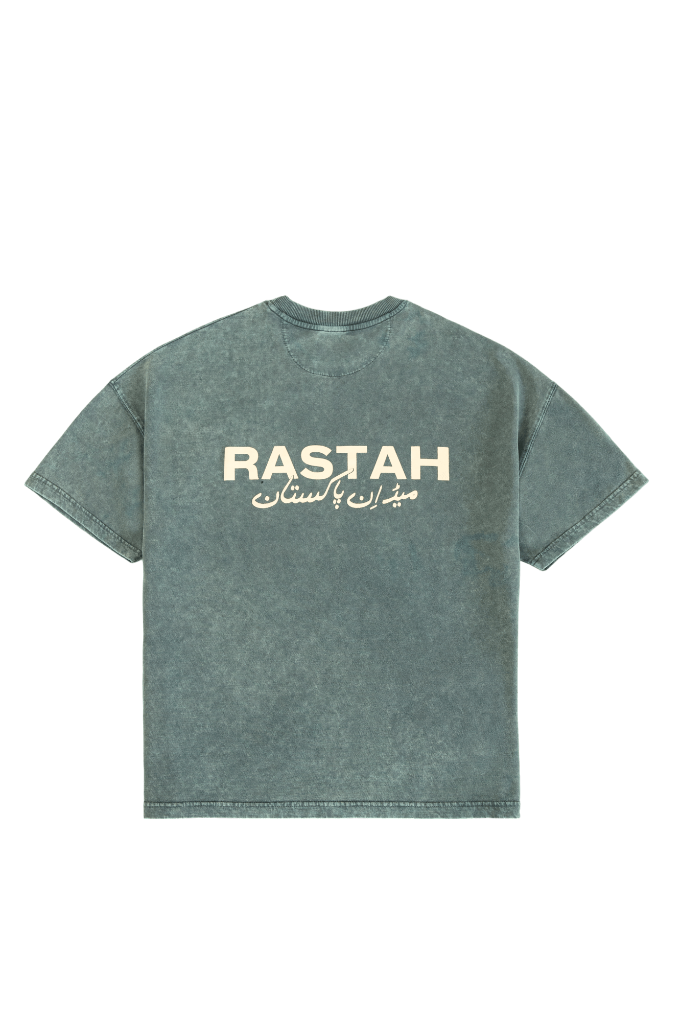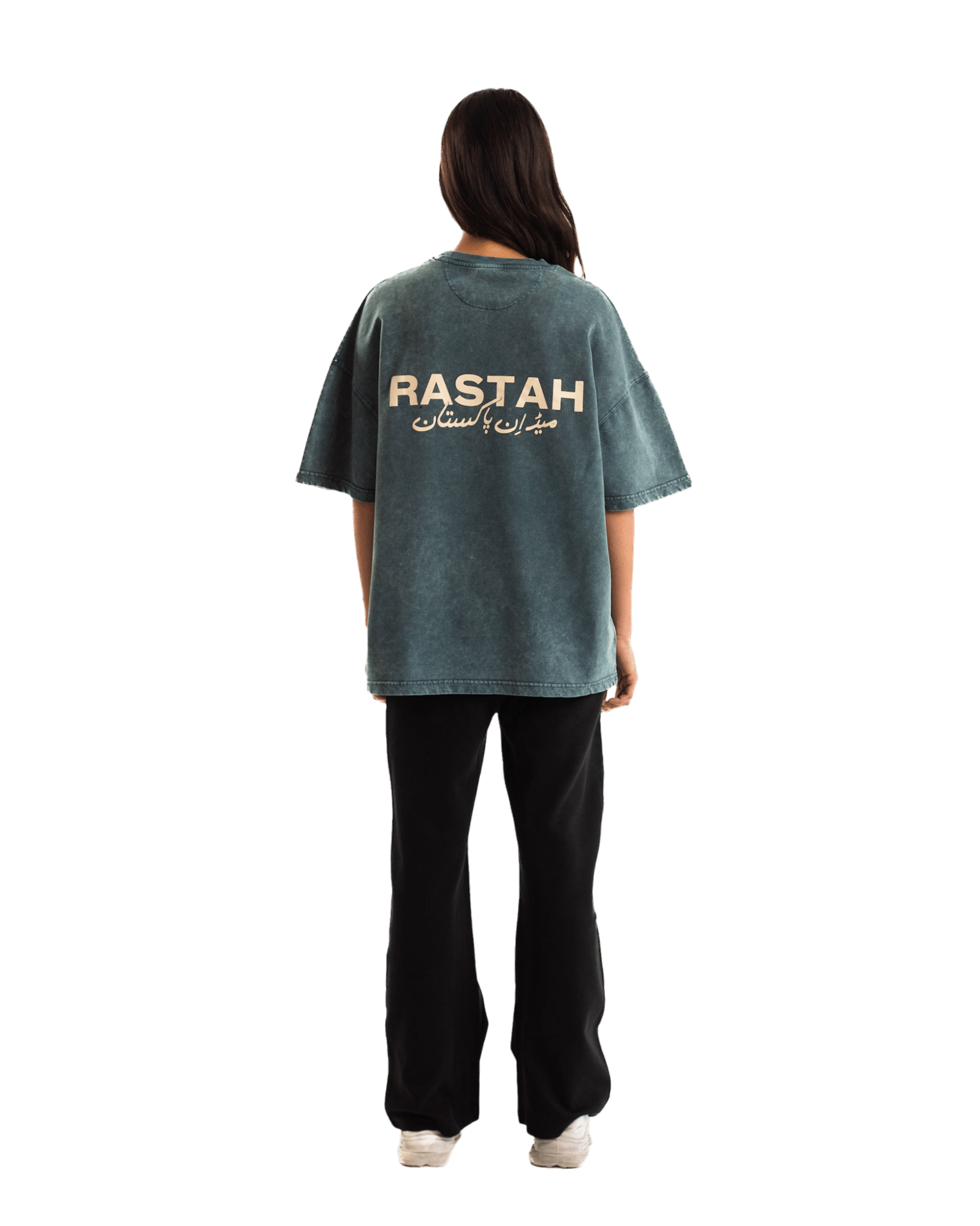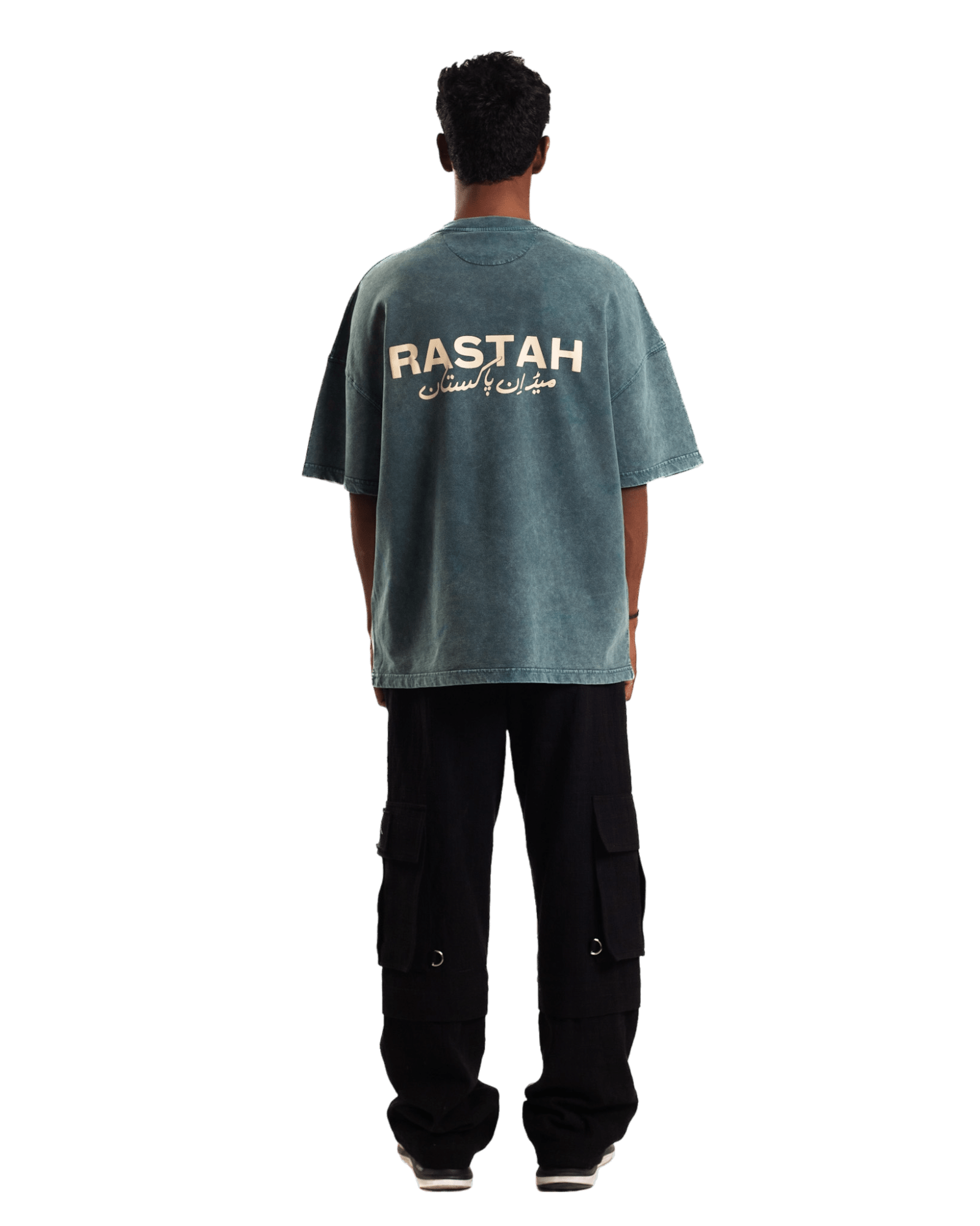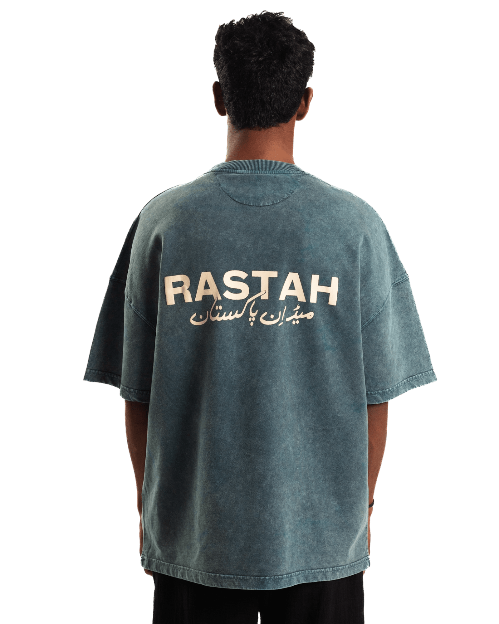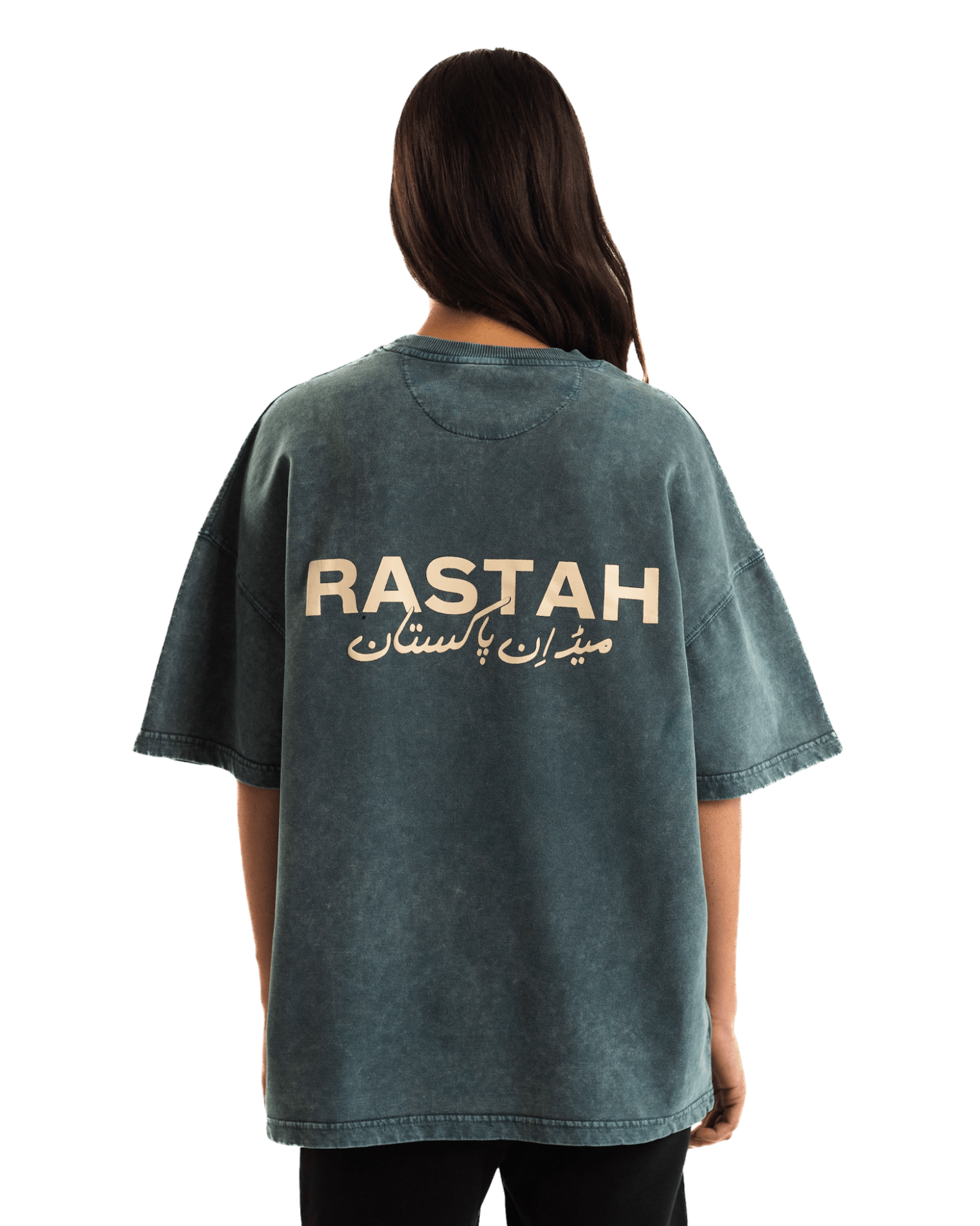 Crafted with meticulous detail, this T-shirt discreetly showcases the Rastah emblem on the front, accompanied by the new "Made in Pakistan" inscription elegantly displayed in Urdu typography on the back. Constructed from 220 GSM acid washed cotton terry fabric, this shirt boasts an oversized fit, ensuring a relaxed yet stylish demeanor. Each garment is dyed to perfection, reflecting Rastah's commitment to quality and individuality.