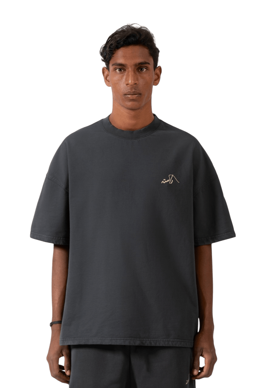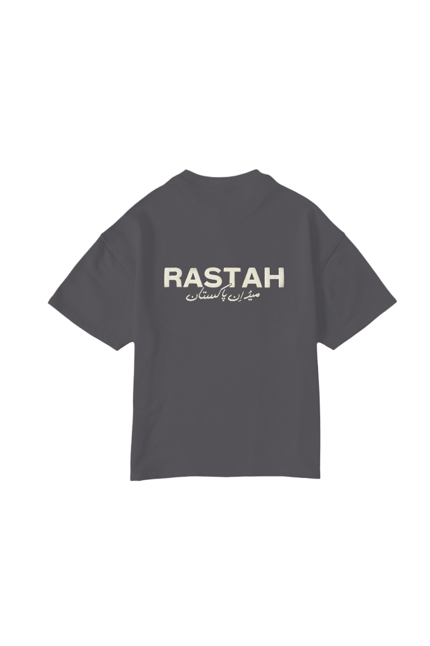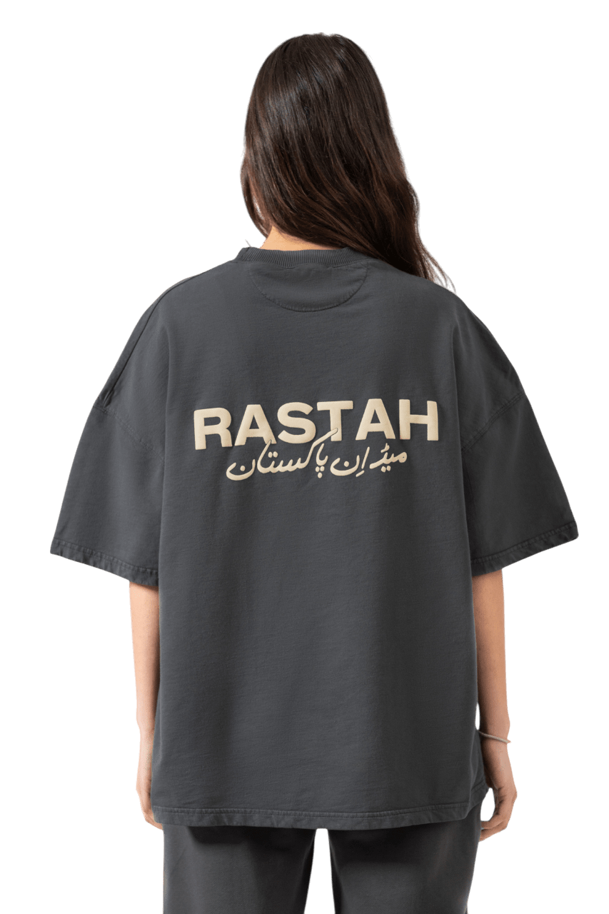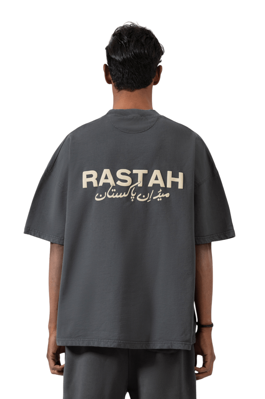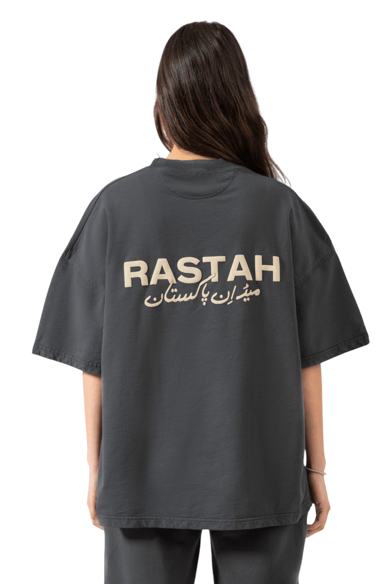 Crafted with meticulous detail, this Grey T-shirt discreetly showcases the Rastah emblem on the front, accompanied by the new "Made in Pakistan" inscription elegantly displayed in Urdu typography on the back. Constructed from 220 GSM cotton terry fabric, this shirt boasts an oversized fit, ensuring a relaxed yet stylish demeanor. Each garment is dyed to perfection, reflecting Rastah's commitment to quality and individuality.