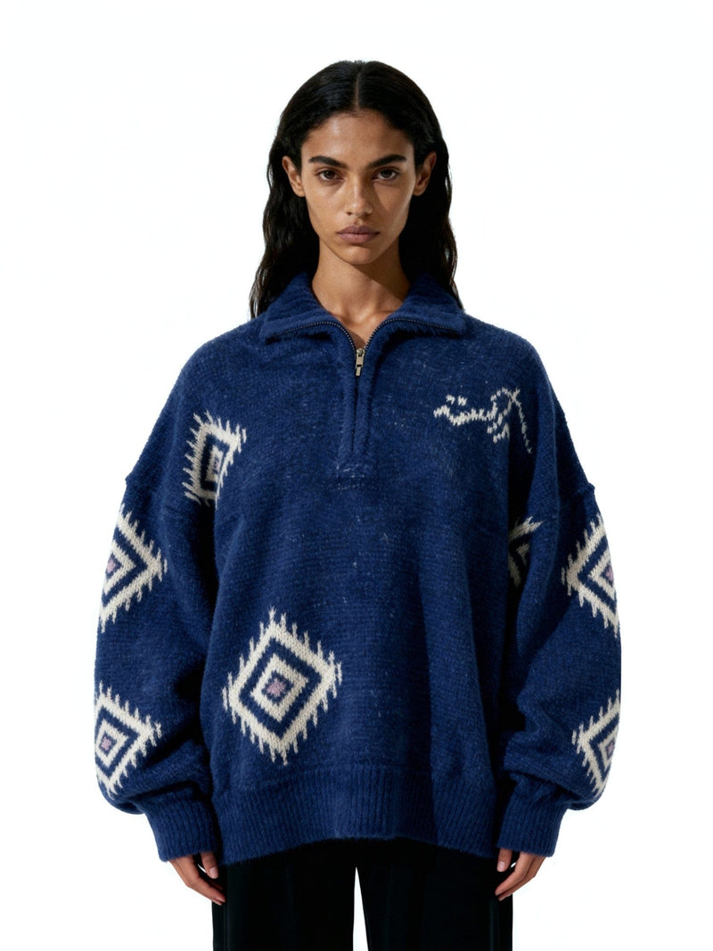 The Mink Motif Pullover combines the richness of traditional motifs with a contemporary half-zip silhouette. Made with a blend of acrylic, nylon, and woolen thread in a muted mink tone, it features diamond-inspired designs that reference regional textile craft.