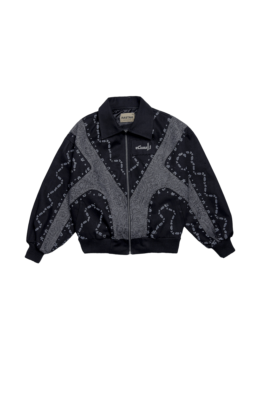 A striking black and grey denim jacket featuring panel detailing, block print design, and an embroidered Rastah logo patch.