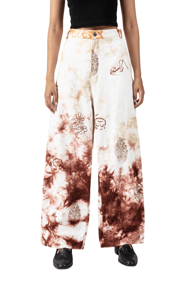 These tie-dye denim pants blend traditional craft with a bold contemporary edge. Featuring hand-applied block prints over earthy-toned tie-dye, the pants offer a distinct streetwear statement with roots in heritage. Each pair is unique due to the hand-dyeing process, making it a wearable piece of art.