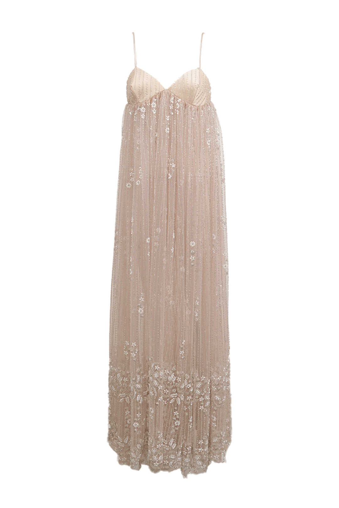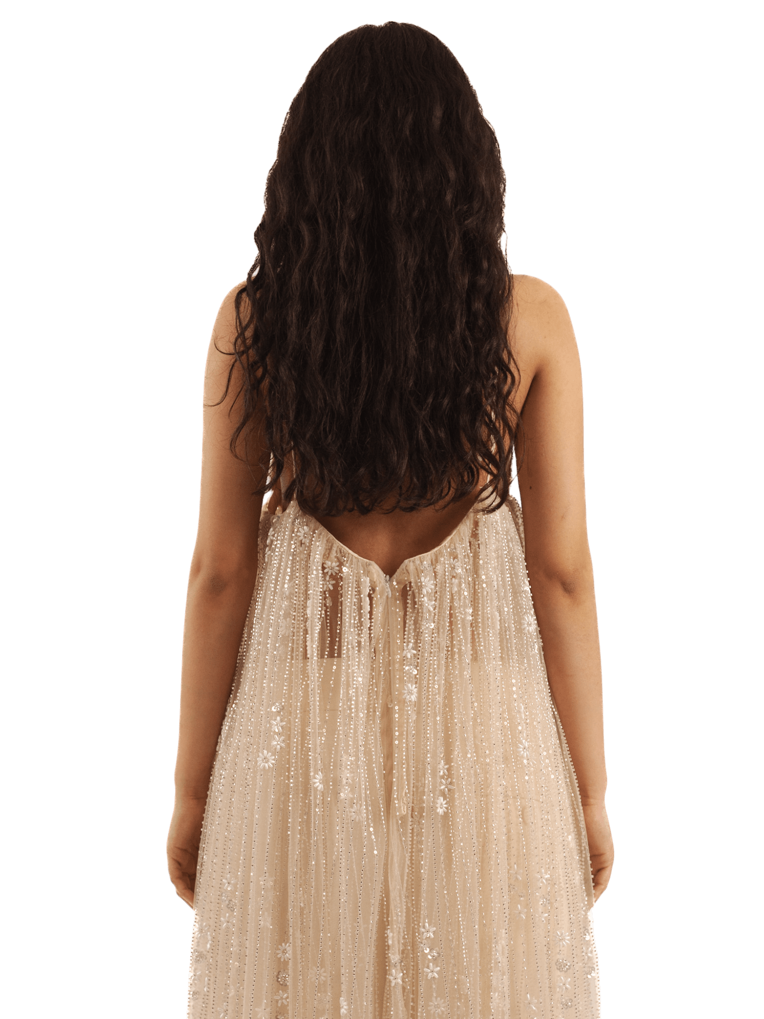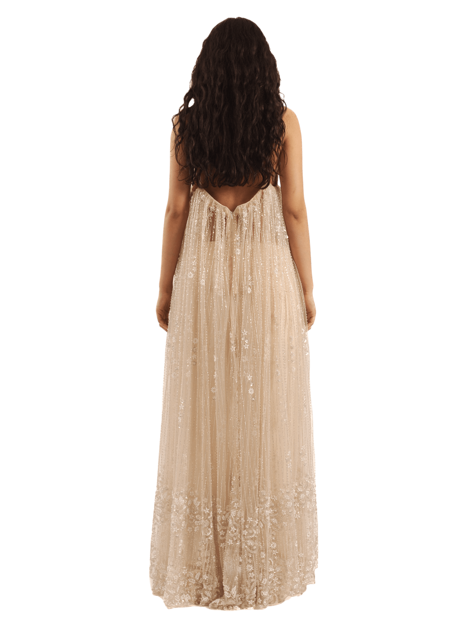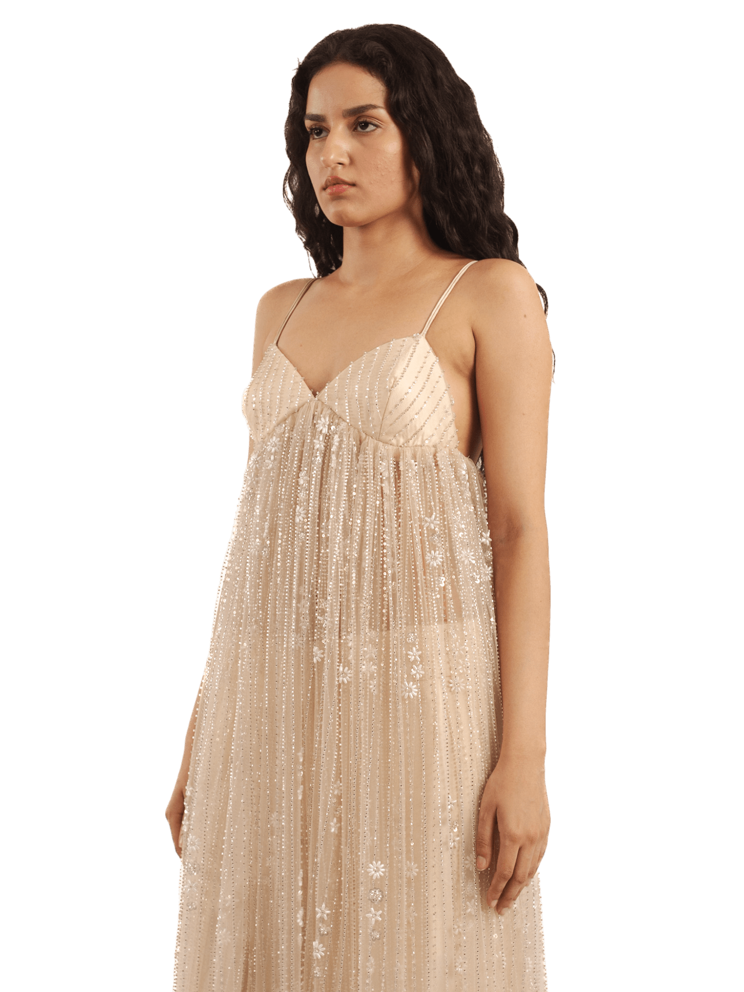 An ethereal vision woven in embellished net, this see-through dress floats like a dream. With delicate spaghetti straps and a soft champagne hue, it drapes the body in sheer elegance, shimmering with floral motifs from top to hem. A romantic silhouette for evenings that blur into memories.