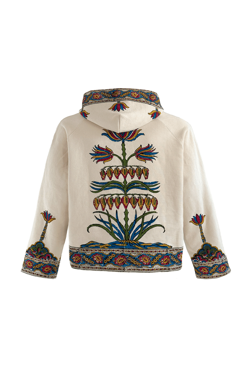 A heavyweight fleece hoodie featuring intricate Kalamkar craftsmanship and traditional block printing. Made from 100% cotton, 500 GSM fleece in a beige hue.