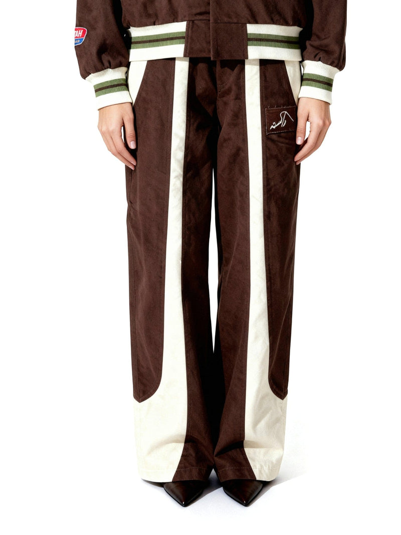 Crafted in denim, they feature sweeping ivory contrast panels that curve down the legs, creating movement and depth. A screen-printed logo patch on the front adds signature branding while maintaining a clean, architectural silhouette. Designed for both structure and ease, these pants embody Rastah’s refined craftsmanship.
